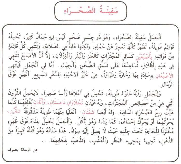 الجملُ سفينةُ الصحراءِ، وهوَ ذو جسمٍ ضخمٍ، ليسَ فيهِ جمالٌ كثيرٌ، تحملُهُ قوائمُ طويلةٌ، تظهرُ كأنها تعجزُ عنْ حملِهِ.