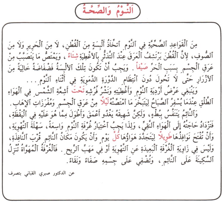 ينبغي عرض أردية النوم وأغطيتِه ونشر فرشه تحت أشعة الشمس في الهواء الطلق عندما يسفر الصباح ليتبخر ما امتصه ليلا من عرق الجسم ومفرزات الإهاب.