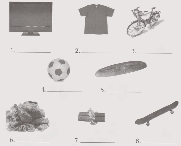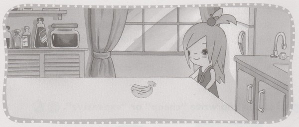 Anna is back from the supermarket. Draw the food on the table. The cake is between the milk and the bananas.The oranges are next to the bananas.