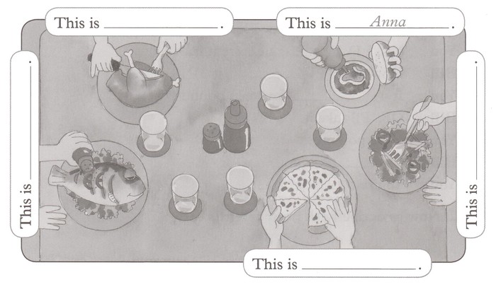 Anna likes hamburgers. May has got pizza. May is on the other side of the table from Harry. Harry doesn’t like fish but Ben likes fish. Mark sits next to Anna.