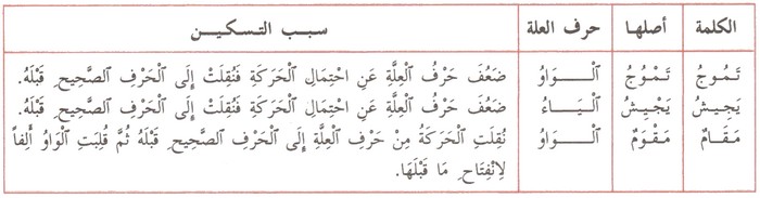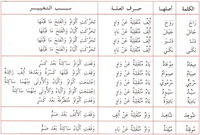 | الكلمة | أصلها | حرف العلة | سبب التغيير |
