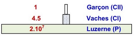 Soit un écosystème composé d’un champ de luzerne de 4 ha qui sert à nourrir des veaux eux-mêmes mangés en un an par un enfant