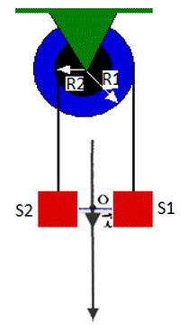 On considère une poulie à double gorges de rayons R1 et R2 tels que R1=2R2=10cm.