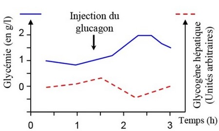 L’injection de glucagon augmente la glycémie et diminue le taux de glycogène hépatique.