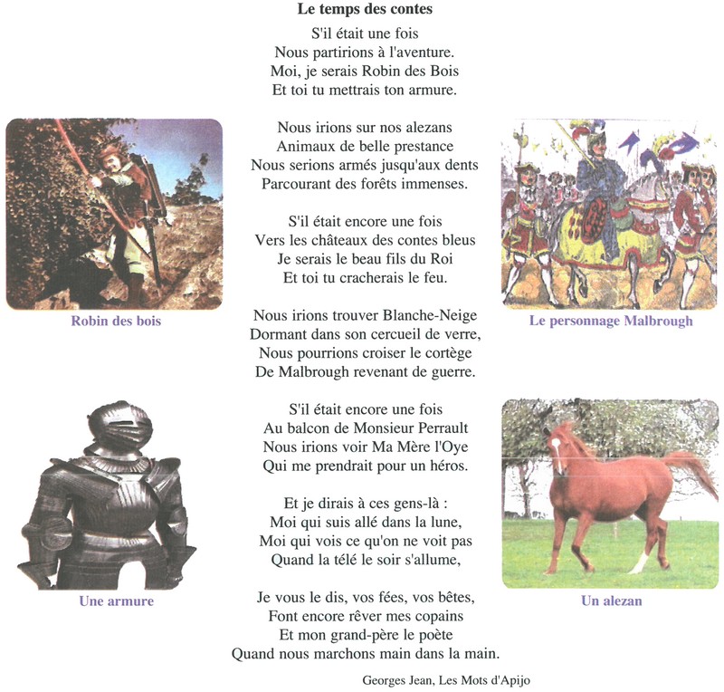 Alezan, Malbrough, Robin des bois, monsieur Perrault, armure, la mère l'oye (l'oie).