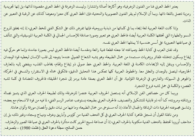 نلاحظ تكرار جزء من العنوان في بداية النص )الخط العربي(، وبيان مكانة الخط العربي بين الفنون الزخرفية.