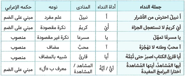 1- المنادى: اسم يذكر بعد «يا» أو غيرها من أدوات النداء طلباً لإقباله على من يناديه.