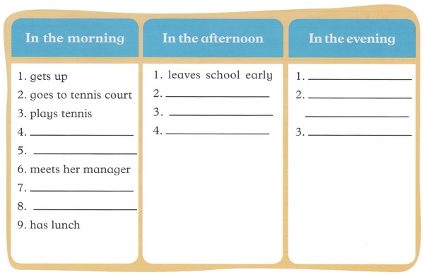 At half past eight she meets her manager at the sports club. They run for an hour. At ten o’clock Tina goes to school. She’s got maths, science, English, art and music. She has lunch at the cafeteria.