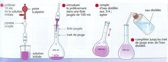 Diluer une solution, c’est ajouter du solvant (l’eau distillé), pour préparer une nouvelle solution moins concentrée que la solution initiale .