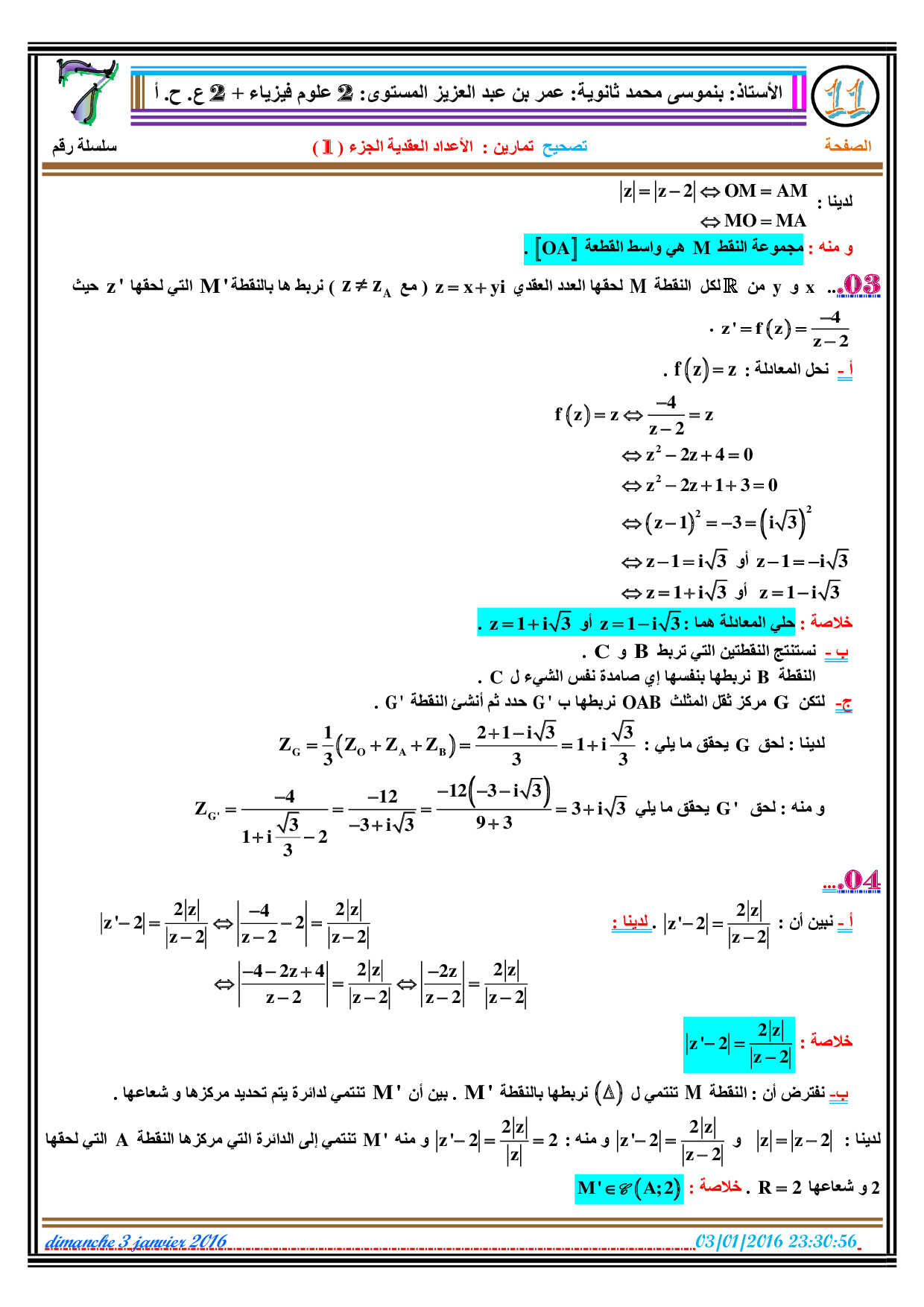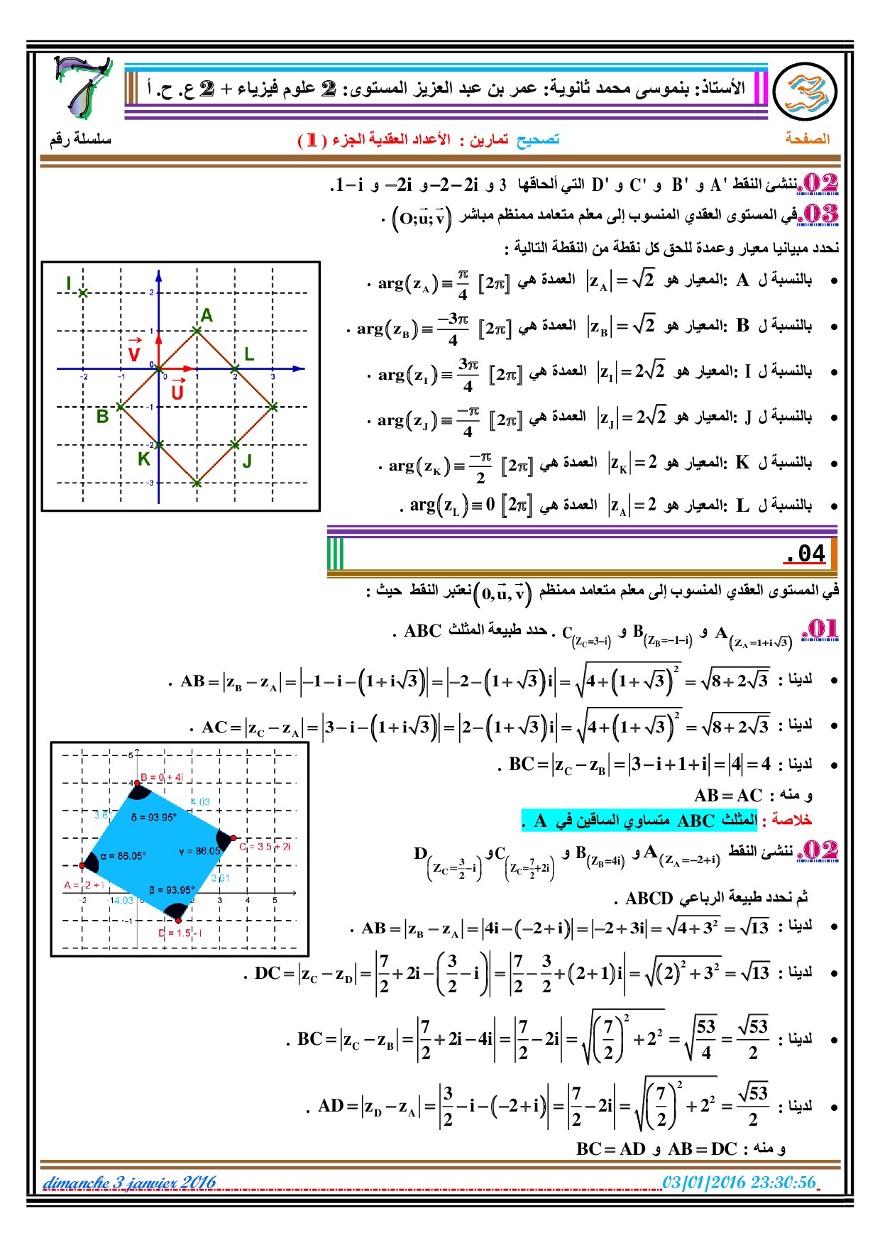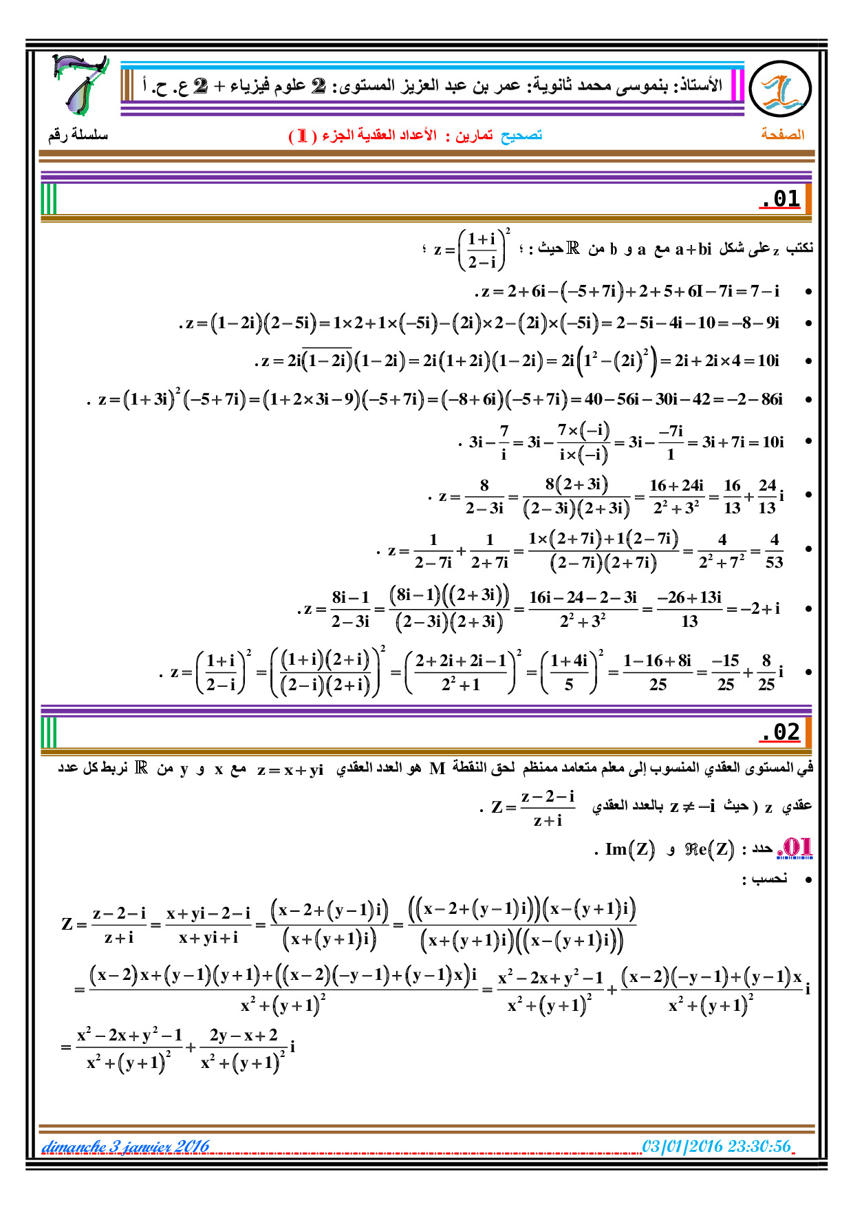 الأعداد العقدية 1 - تصحيح سلسلة التمارين 1