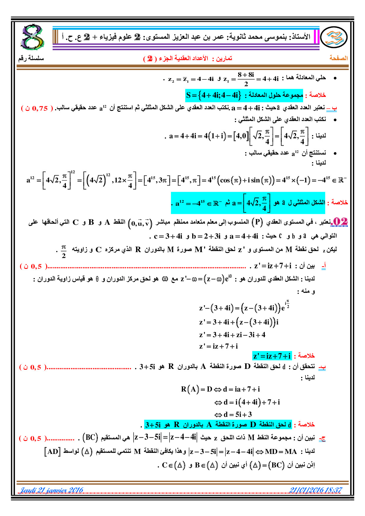 الأعداد العقدية 2 - تصحيح سلسلة التمارين 1