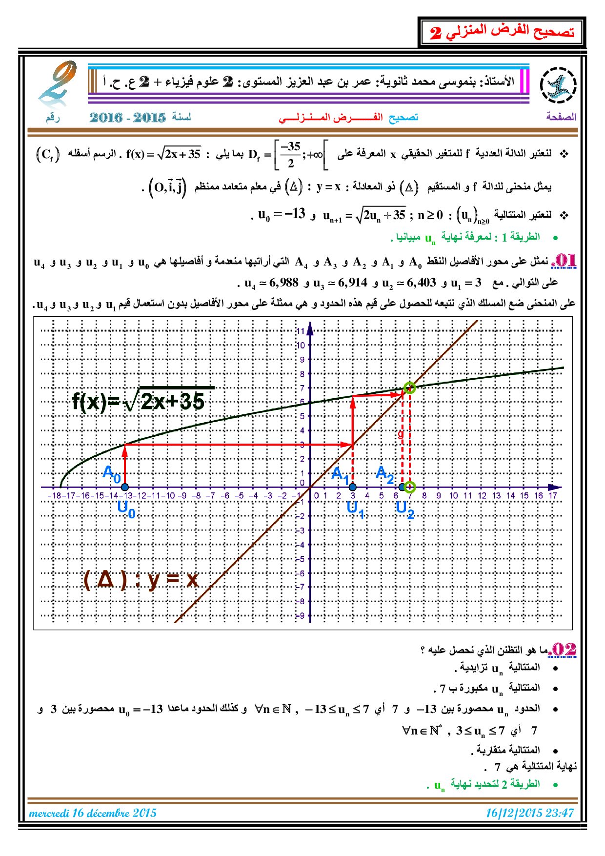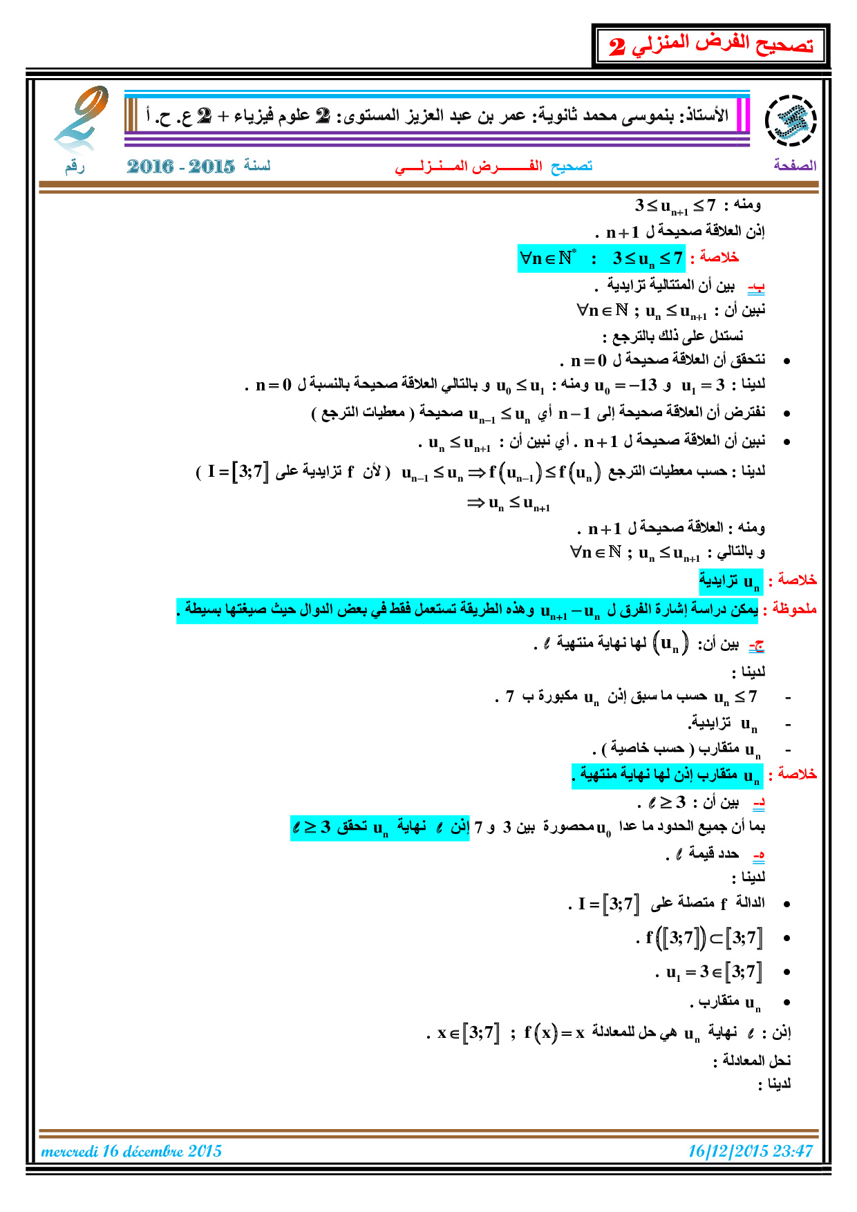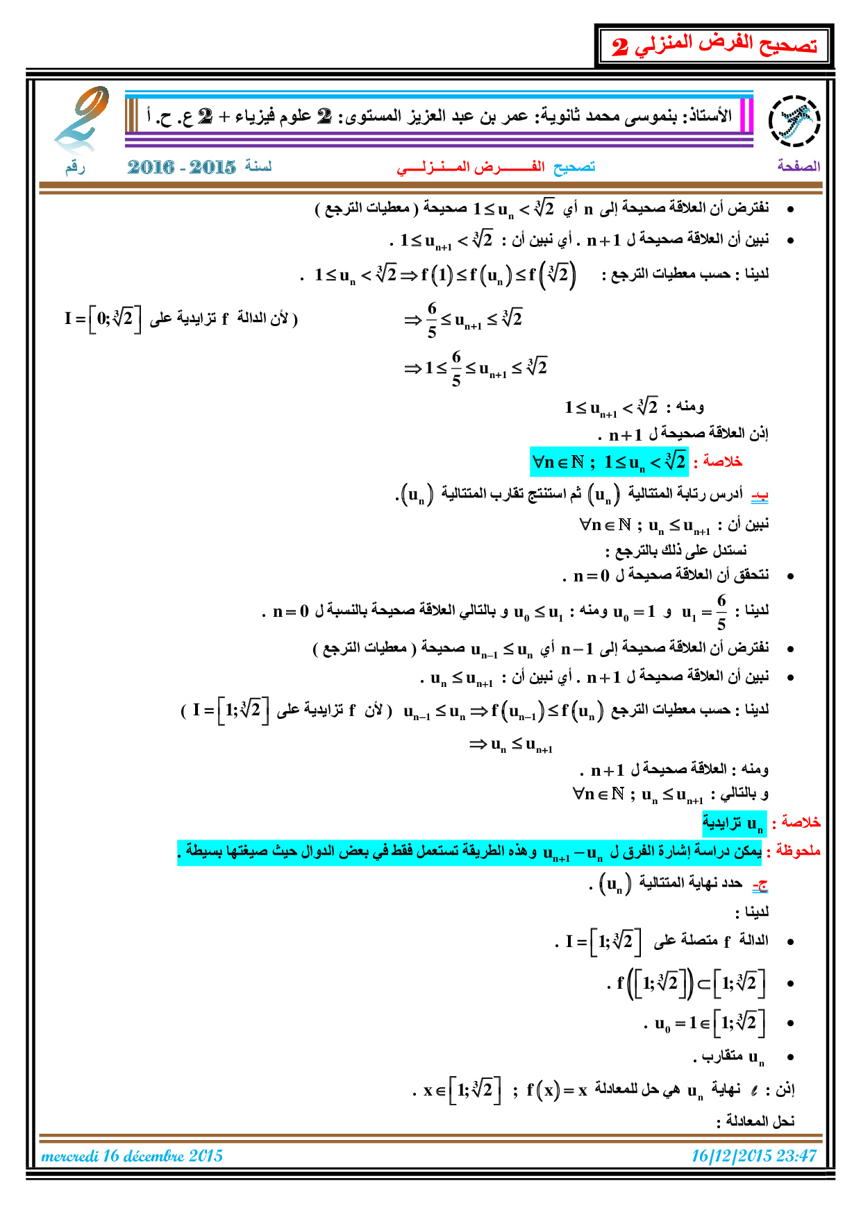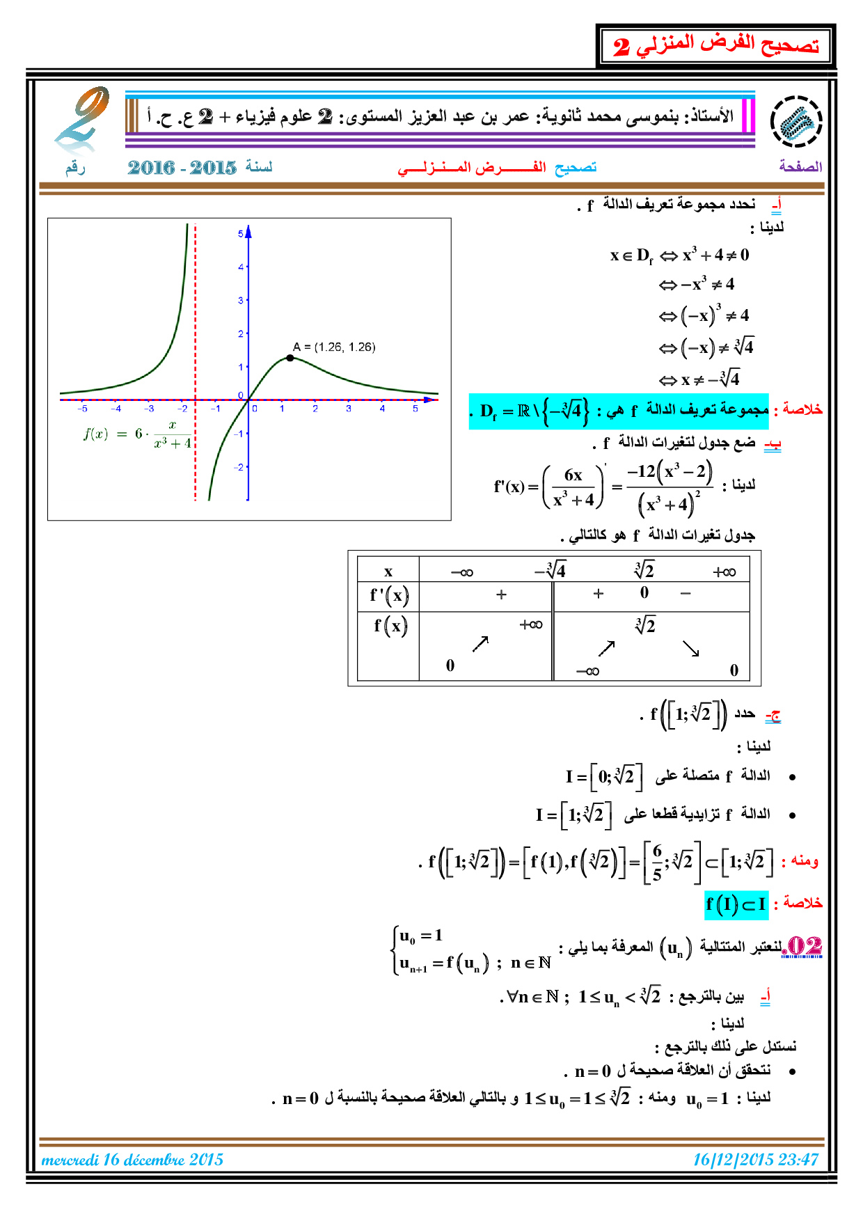 الفرض 2 نموذج 3 - الرياضيات ثانية باك علوم وتقنيات الدورة الأولى (التصحيح)