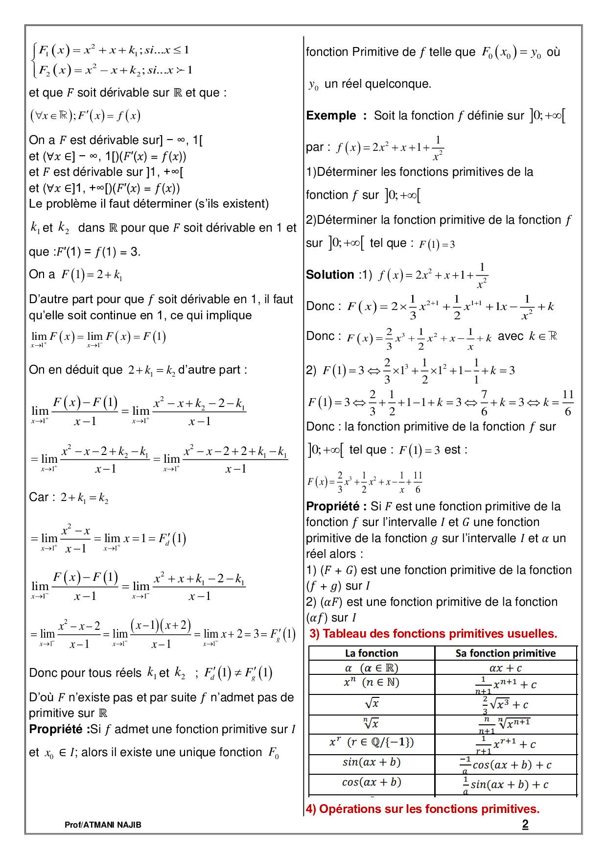 Fonctions primitives - Cours et exercices corrigés