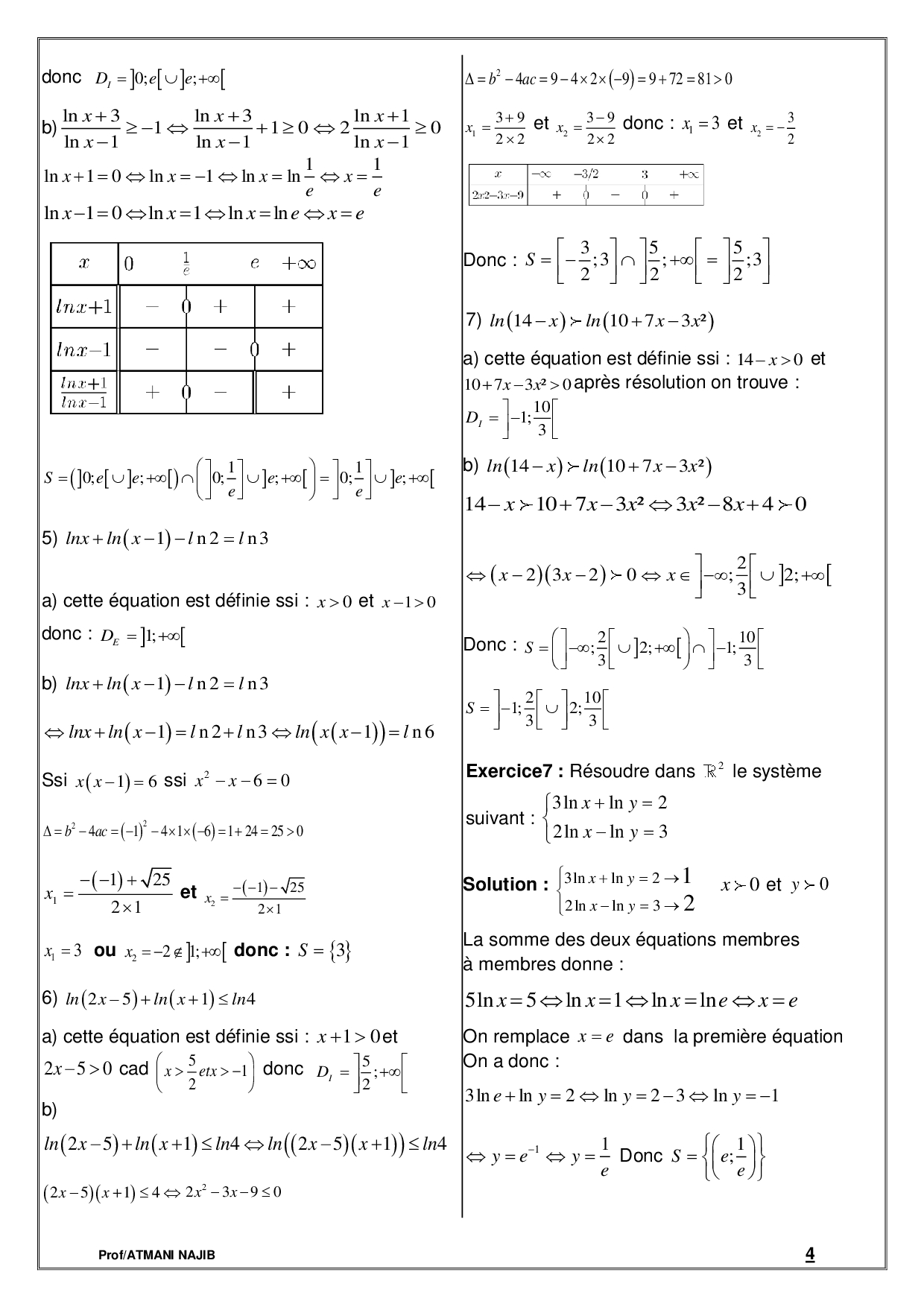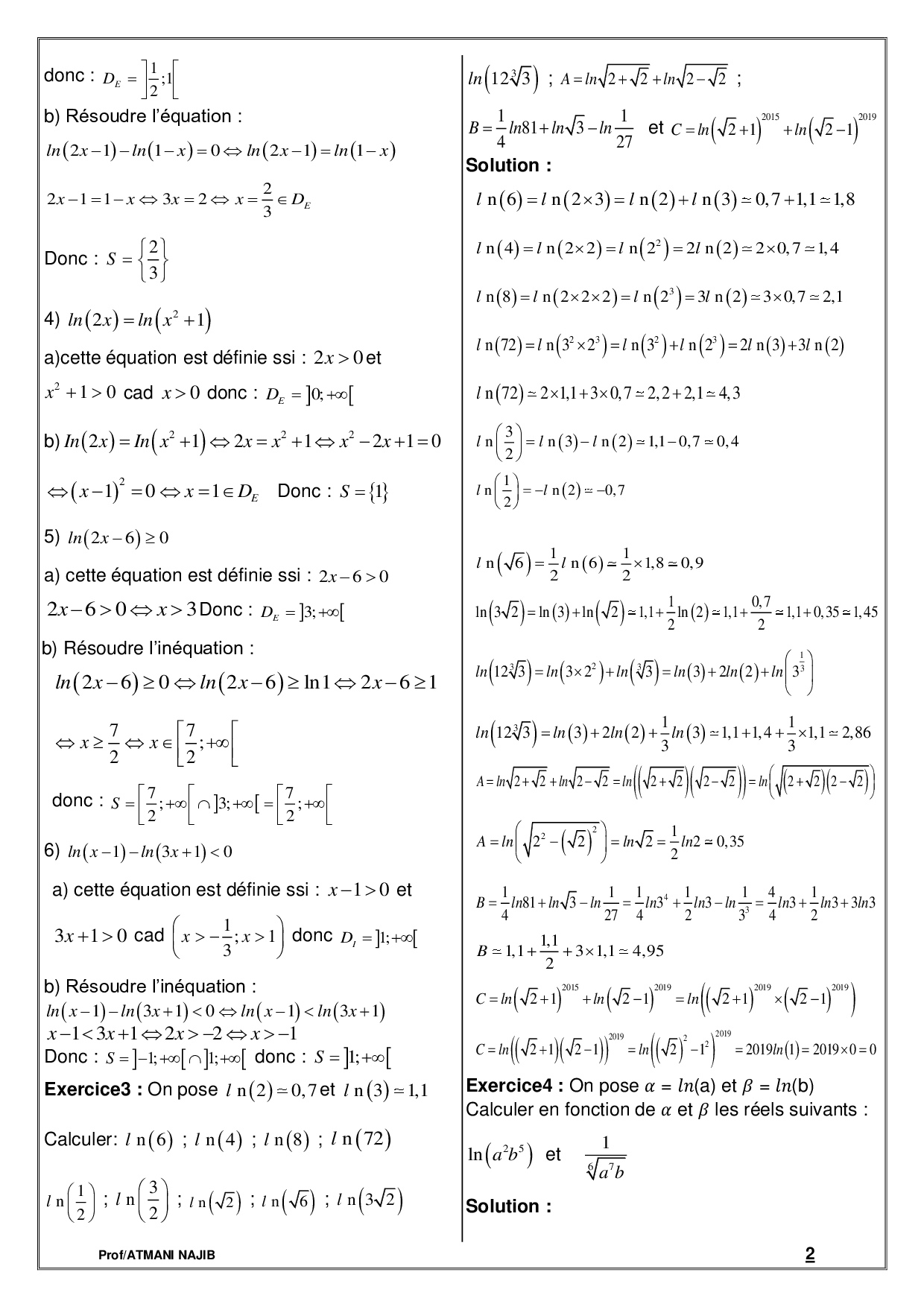 Fonctions logarithmiques - Corrigé série d'exercices 1