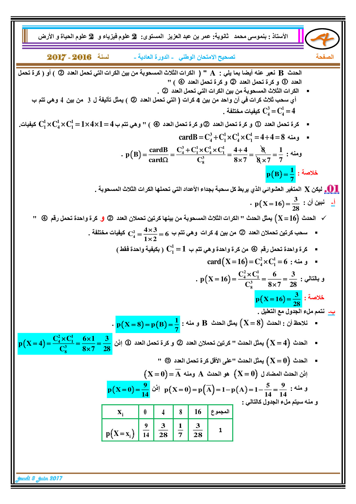 الرياضيات للشعب العلمية والتكنولوجية 2017 الدورة العادية - التصحيح 1