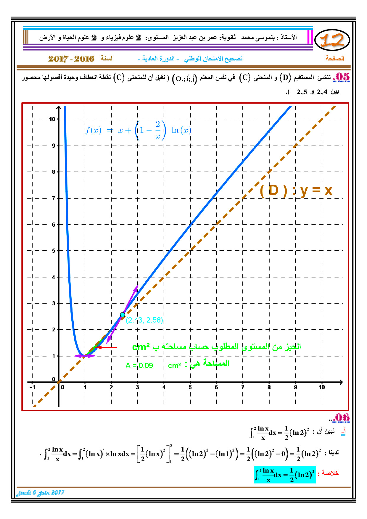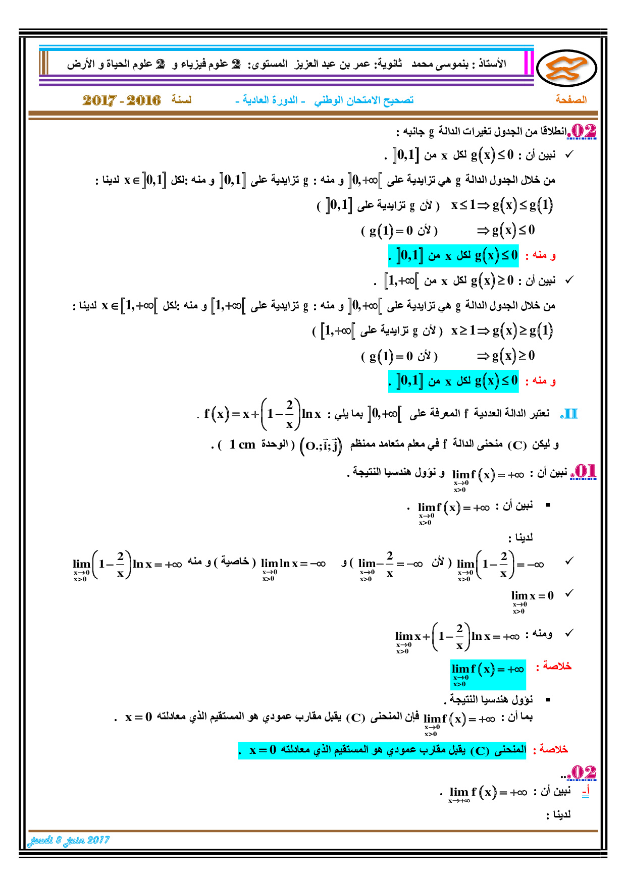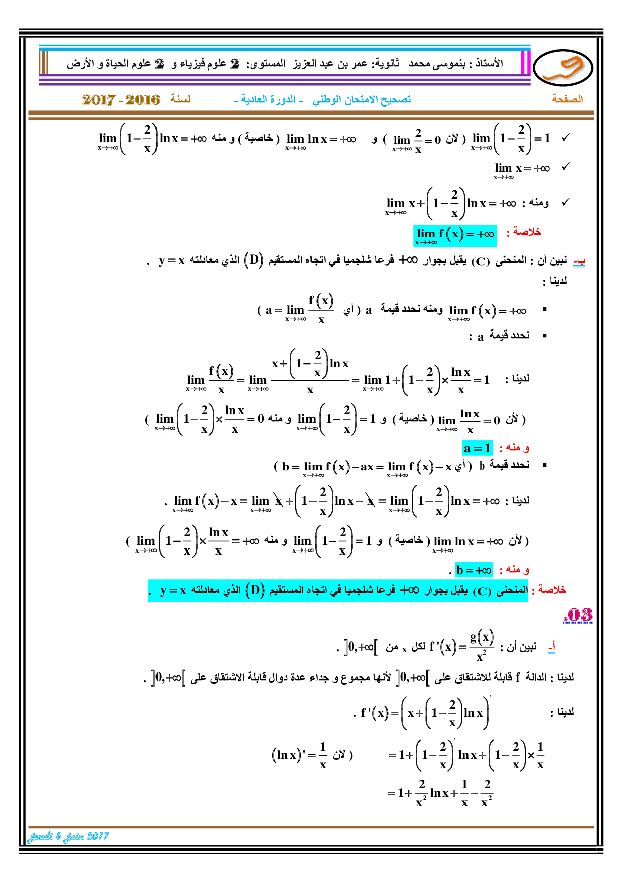 الرياضيات للشعب العلمية والتكنولوجية 2017 الدورة العادية - التصحيح 1