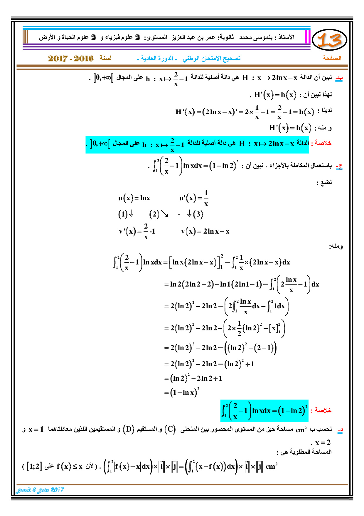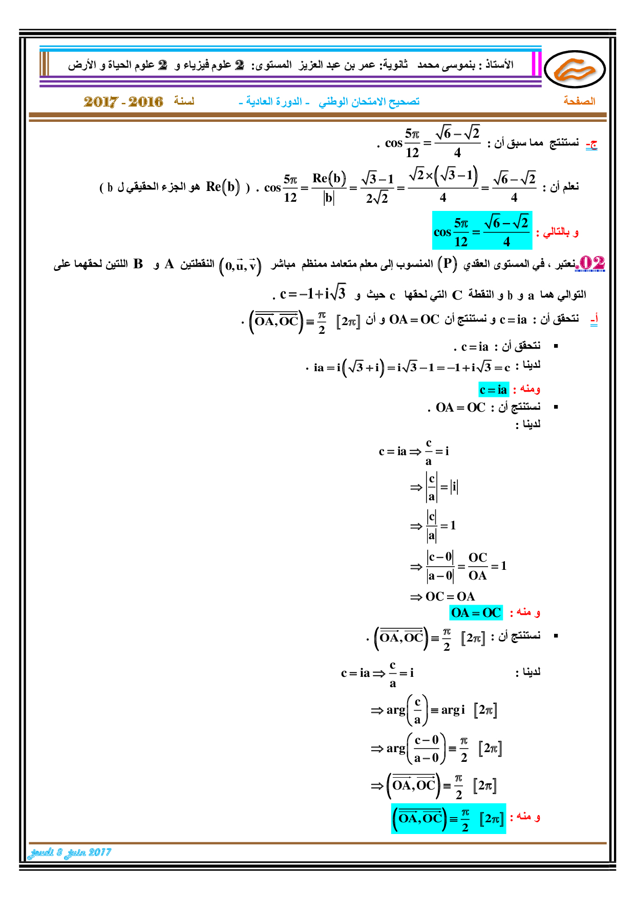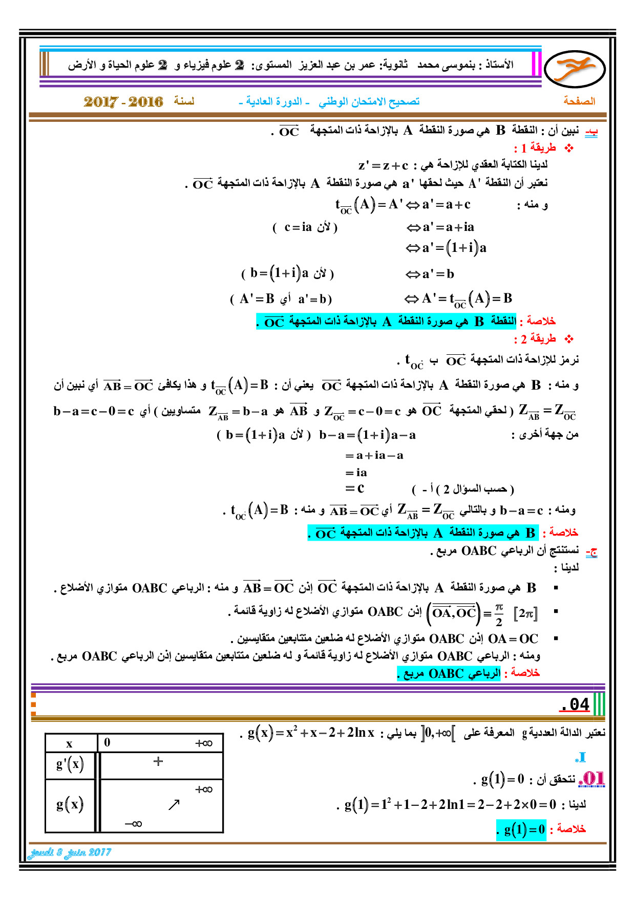 الرياضيات للشعب العلمية والتكنولوجية 2017 الدورة العادية - التصحيح 1