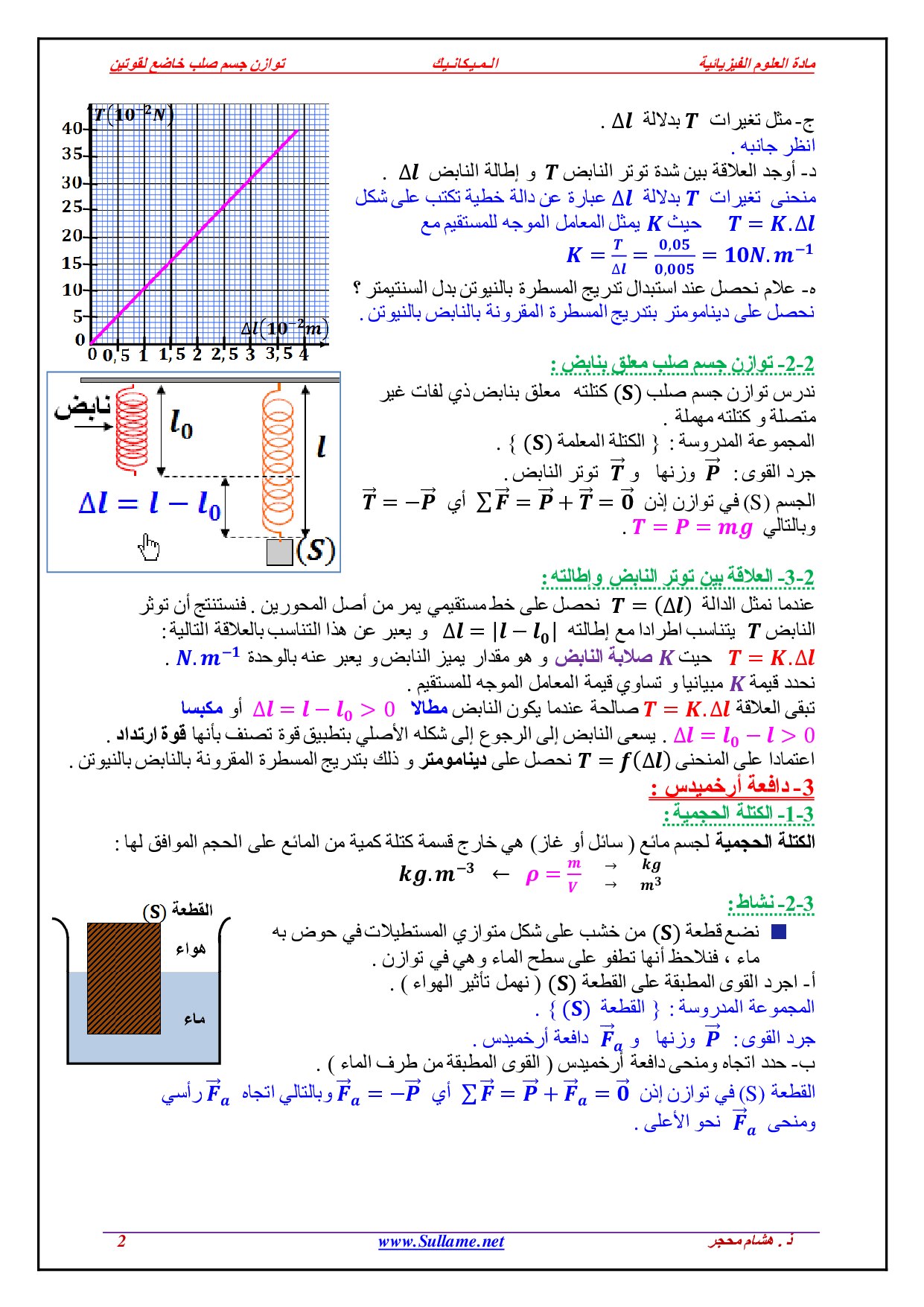 توازن جسم خاضع لقوتين (القوة المطبقة من طرف نابض - دافعة أرخميدس)