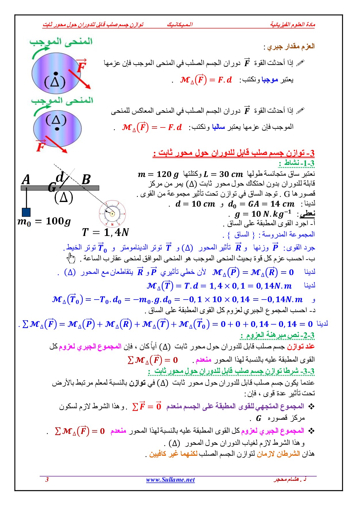 توازن جسم صلب قابل للدوران حول محور تابث - الدرس 1