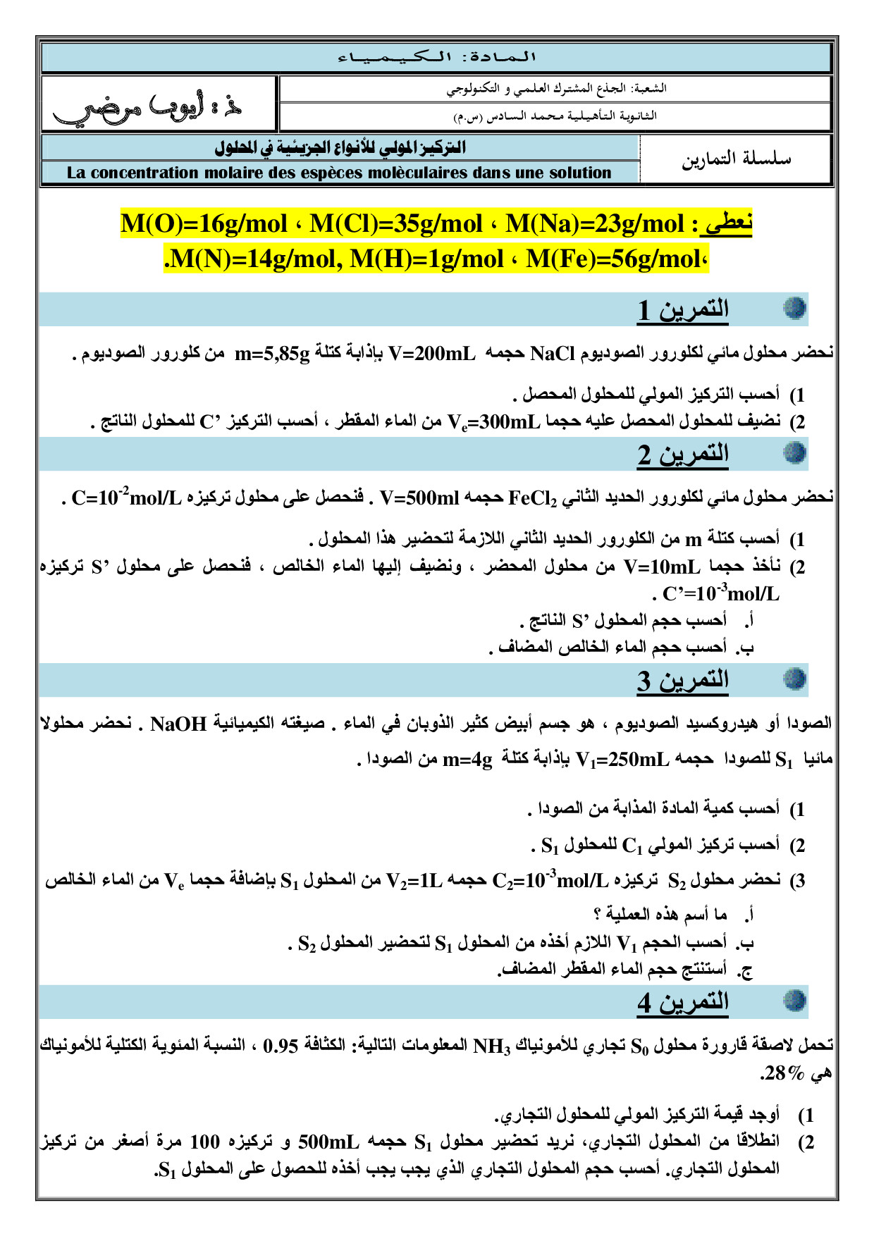 التركيز المولي للأنواع الكيميائية في محلول - تمارين غير محلولة 3