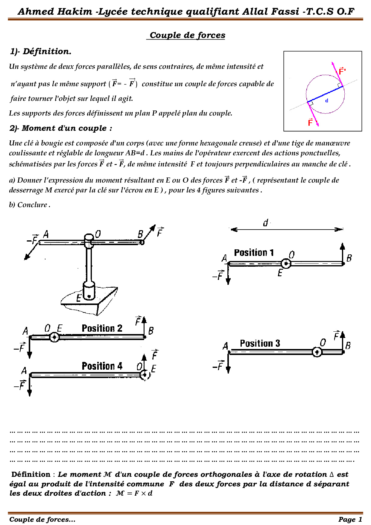 Moment d'un couple de forces - Moment d'un couple de torsion - Cours 1