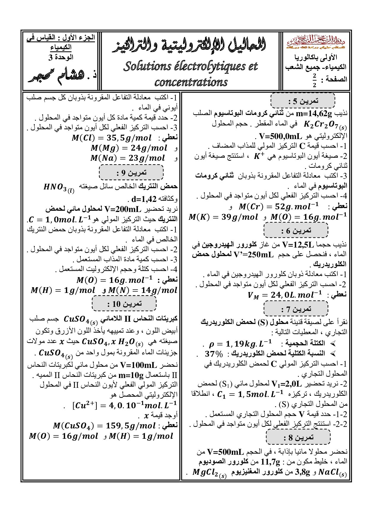 التركيز والمحاليل الإلكتروليتية - تمارين غير محلولة 1