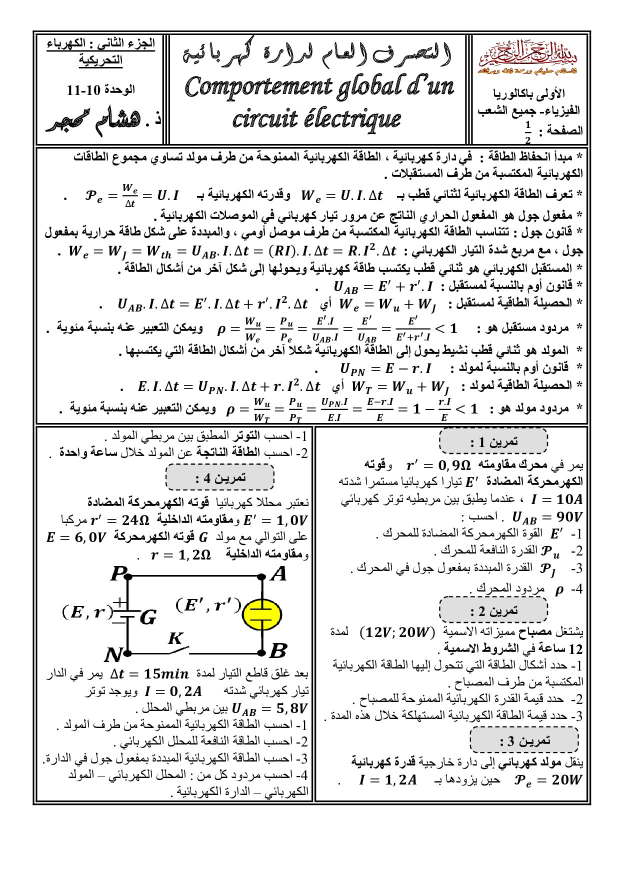 انتقال الطاقة في دارة كهربائية - التصرف العام لدارة كهربائية