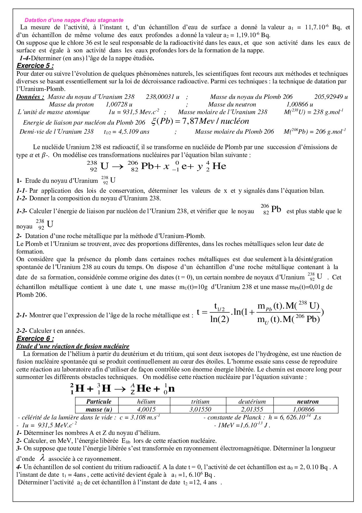 Noyaux, masse et énergie - Exercices non corrigés 7