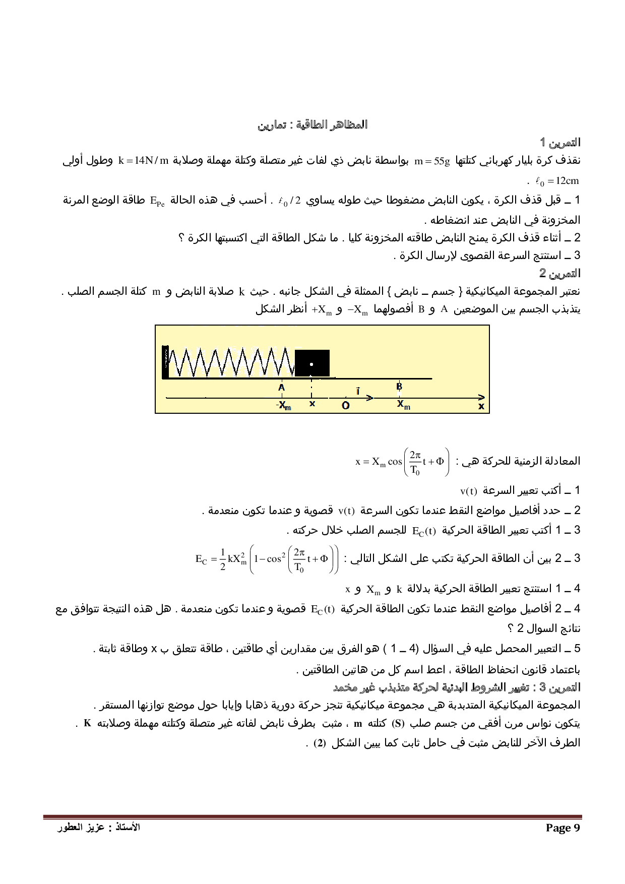 المظاهر الطاقية للتذبذبات الميكانيكية - تمارين غير محلولة 1