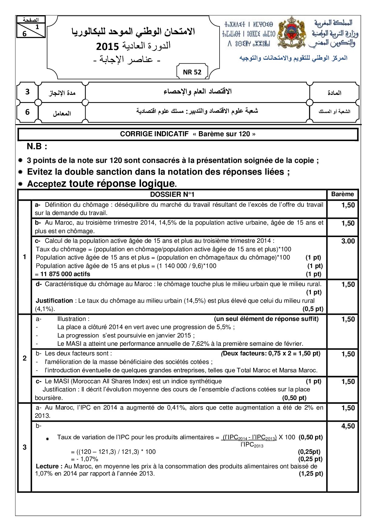 Examen Statistiques 2 Bac Eco 2015 Session Normale - Corrigé