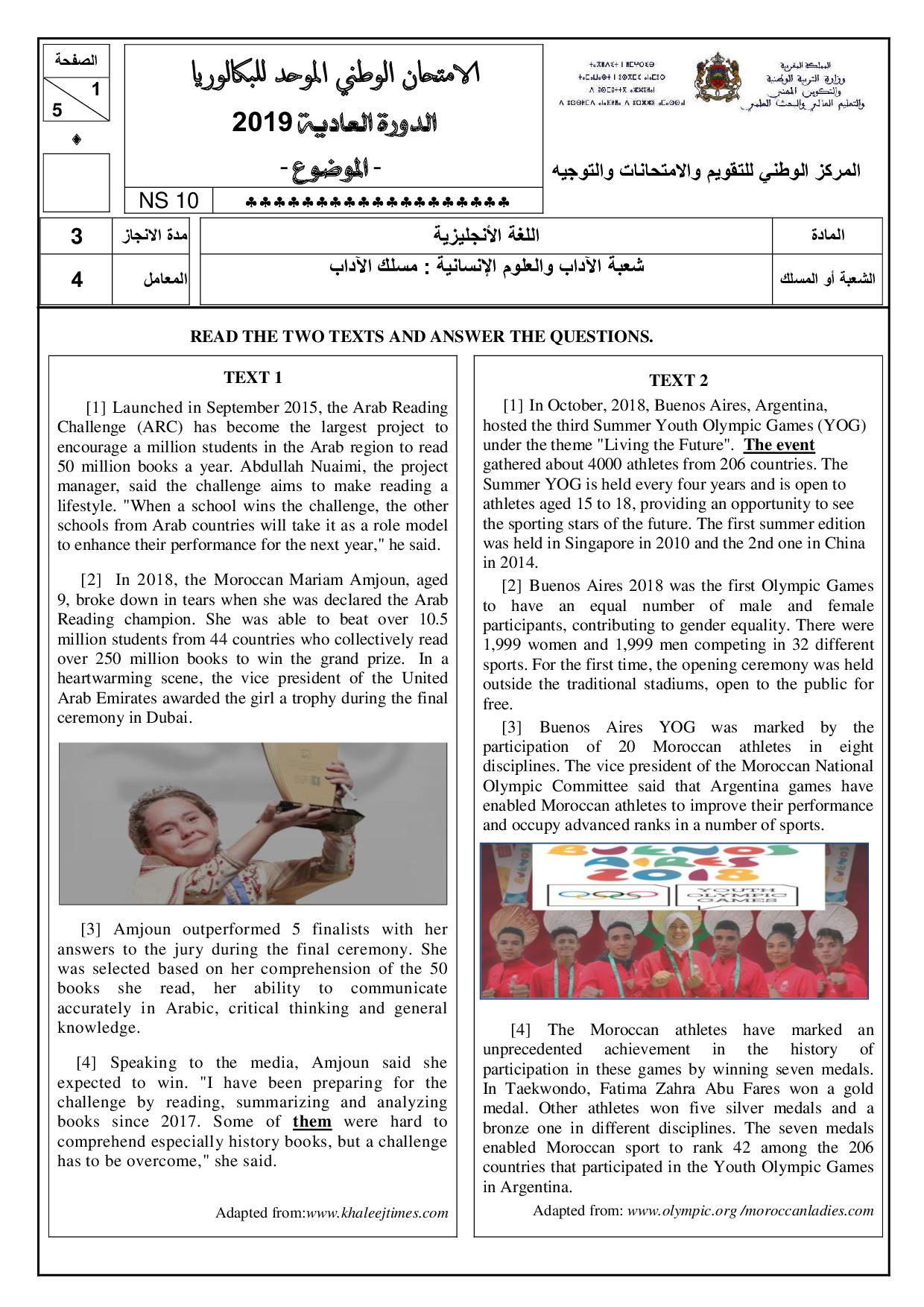 Examen Anglais Lettres 2019 Session Normale - Sujet