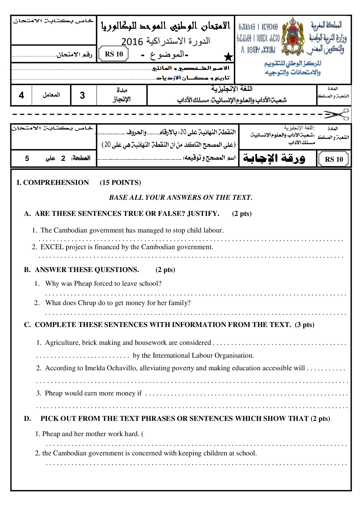 Examen Anglais Lettres 2016 Session Rattrapage - Sujet