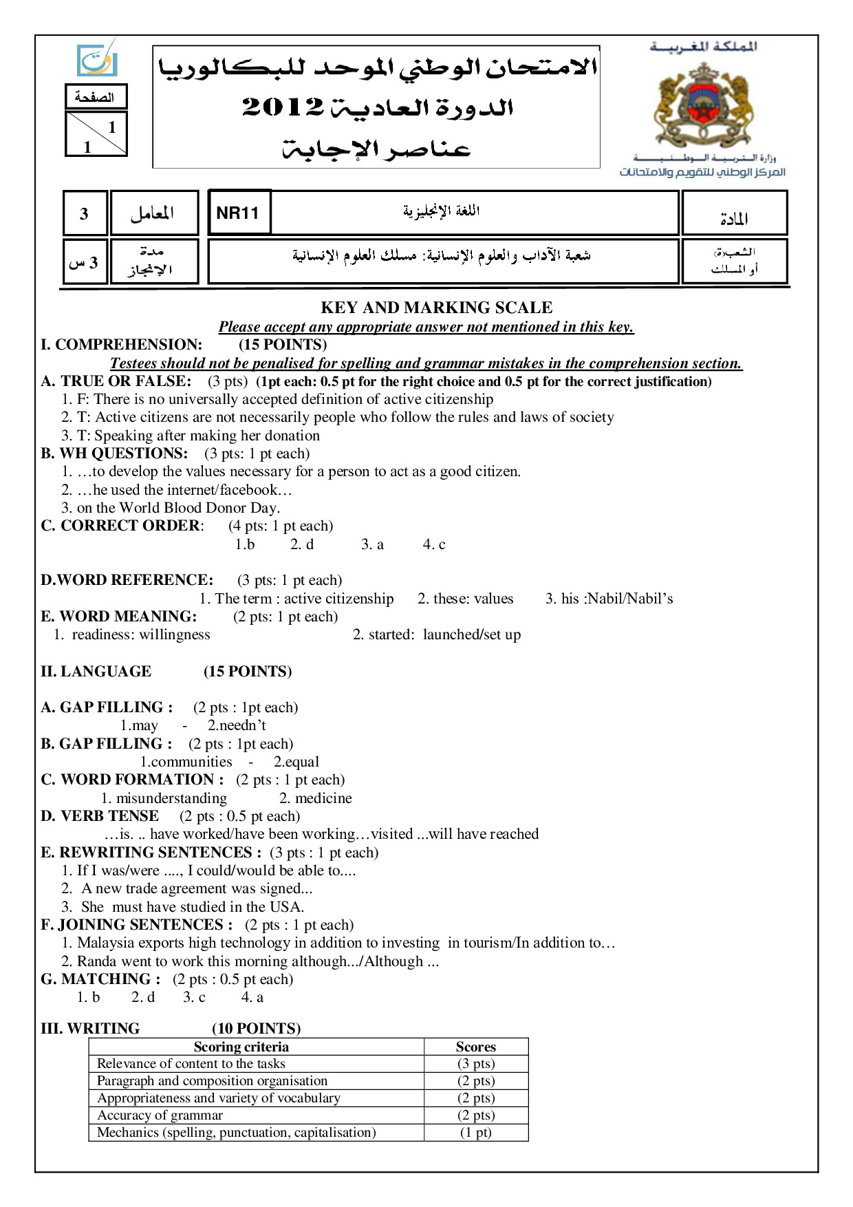 Examen Anglais Science Humaines 2012 Session Normale - Corrigé