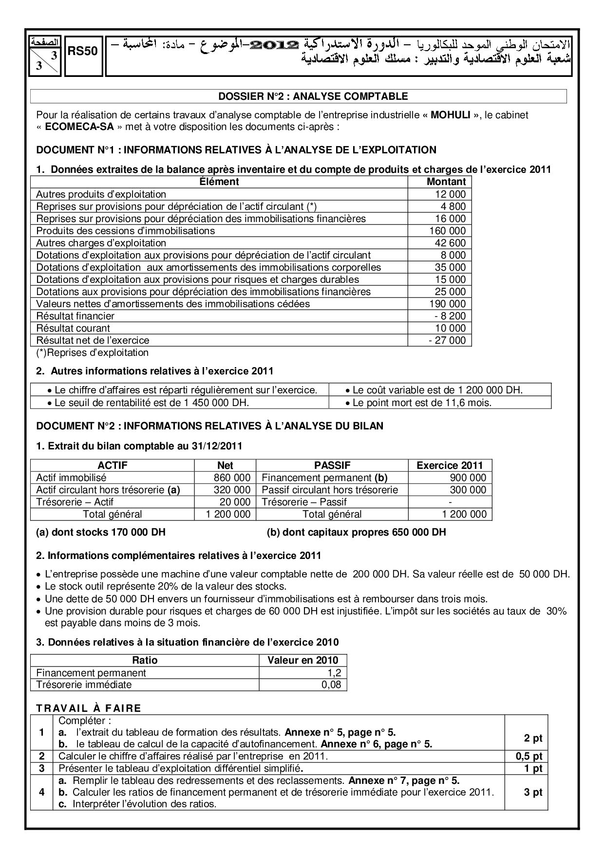 Examen Comptabilité 2 Bac Eco 2012 Session Rattrapage - Sujet