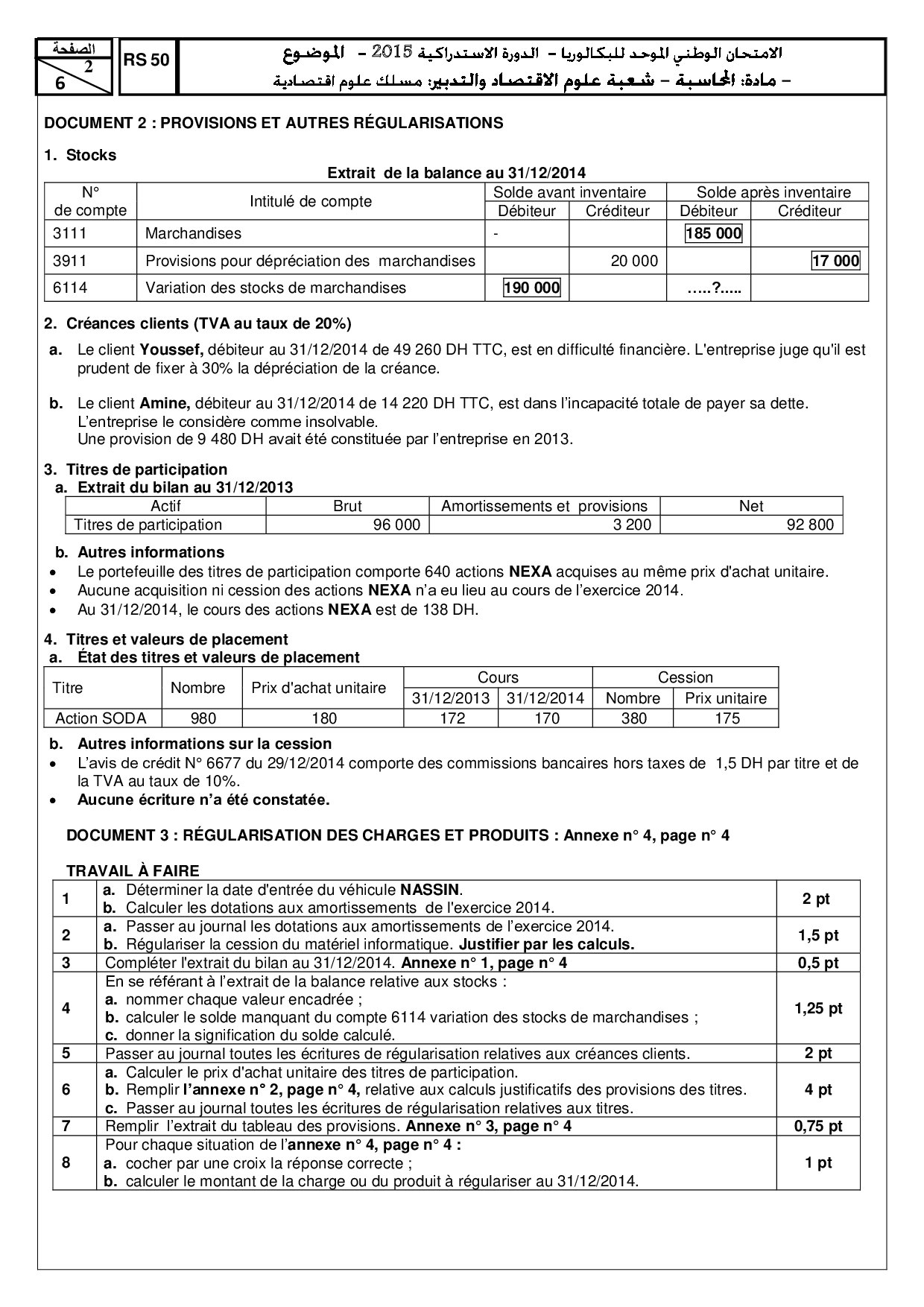 Examen Comptabilité 2 Bac Eco 2015 Session Rattrapage - Sujet