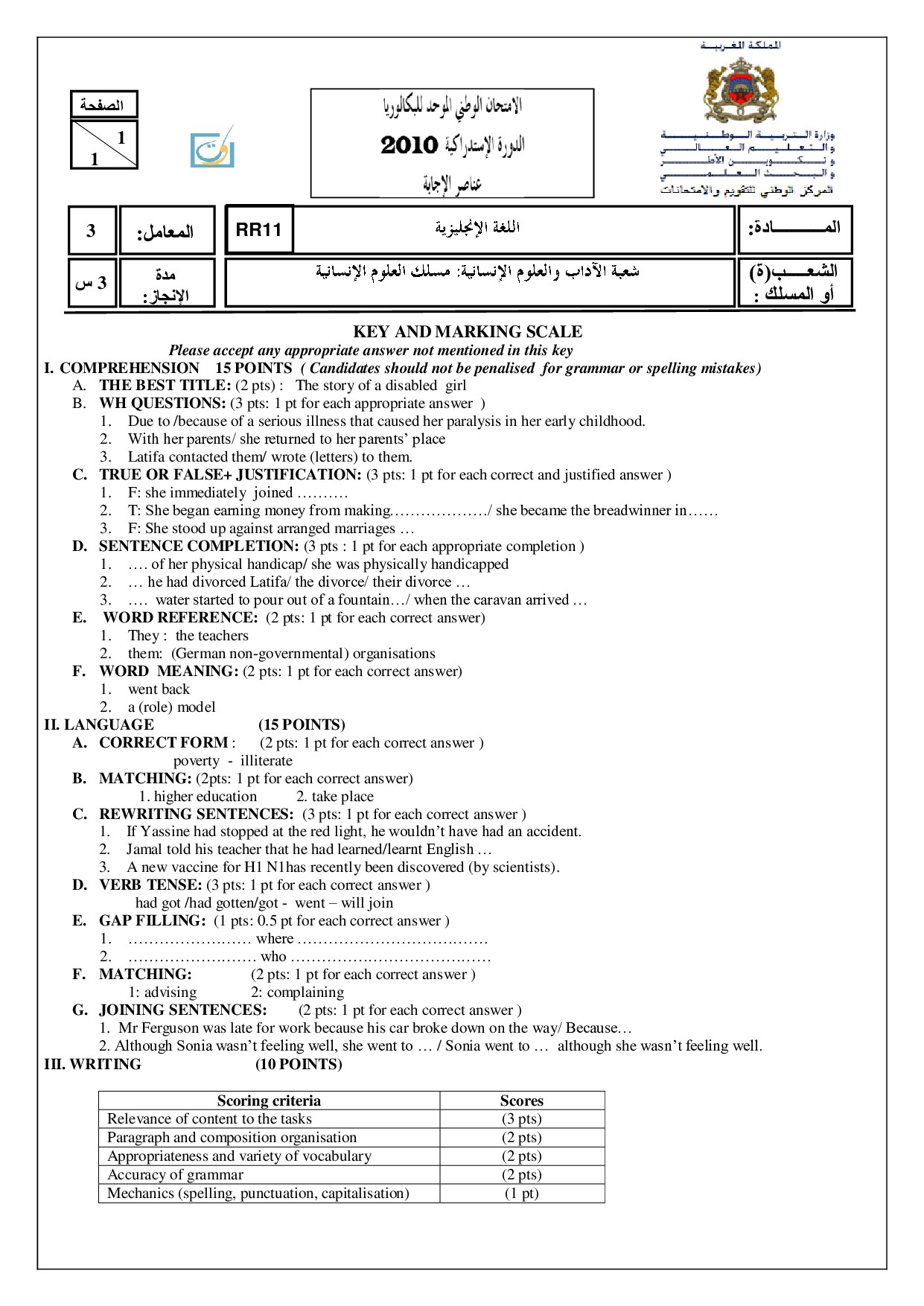 Examen Anglais Science Humaines 2010 Session Rattrapage - Corrigé
