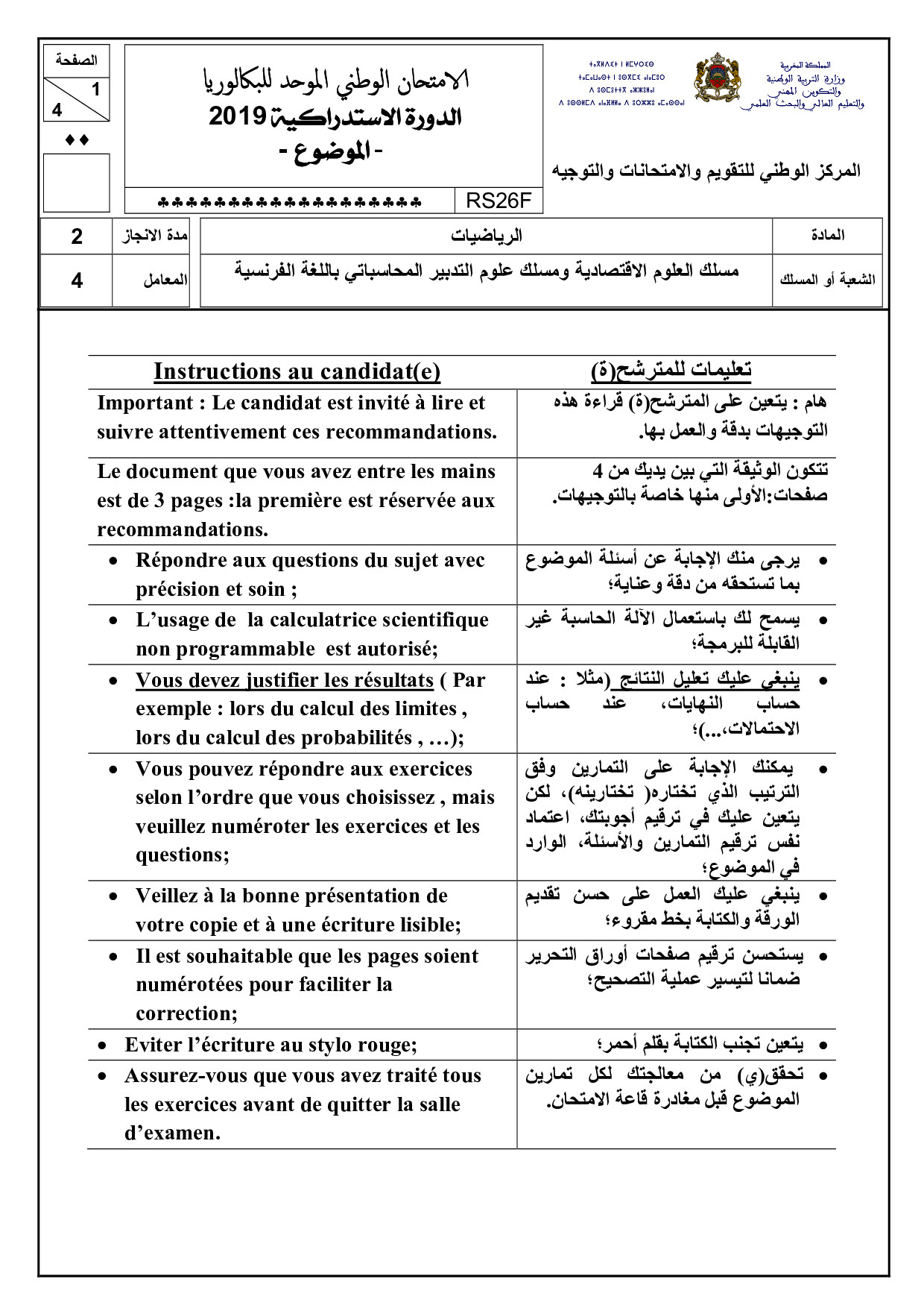 Examen National Maths 2Bac Eco-SGC 2019 Rattrapage - Sujet