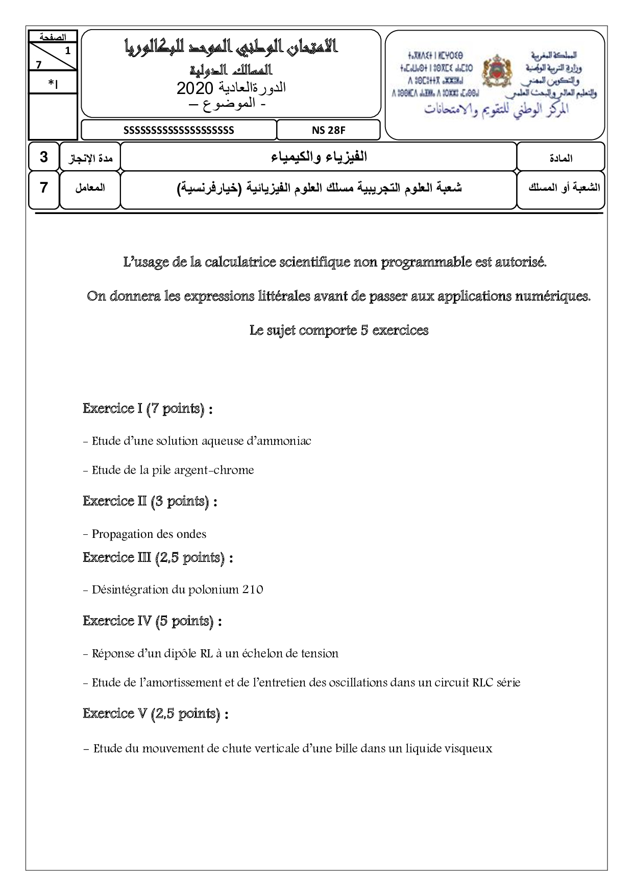Examen National Physique-Chimie SPC 2020 Normale - Sujet