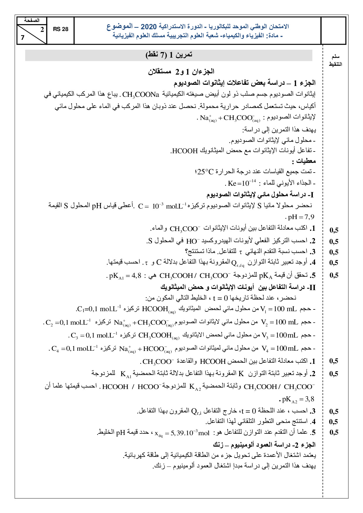 الفيزياء والكيمياء علوم فيزيائية 2020 الدورة الإستدراكية - الموضوع