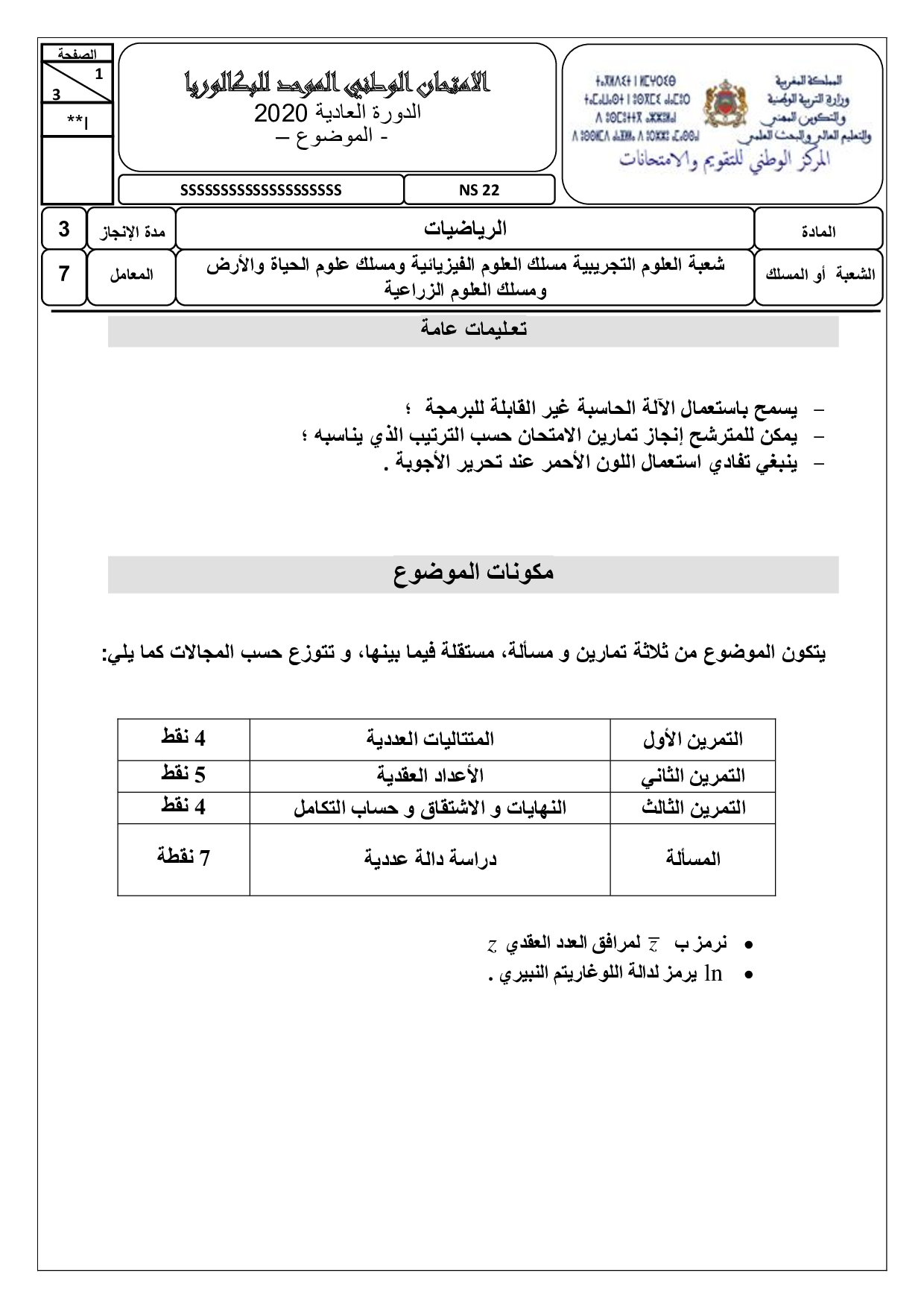 الرياضيات للشعب العلمية والتكنولوجية 2020 الدورة العادية - الموضوع