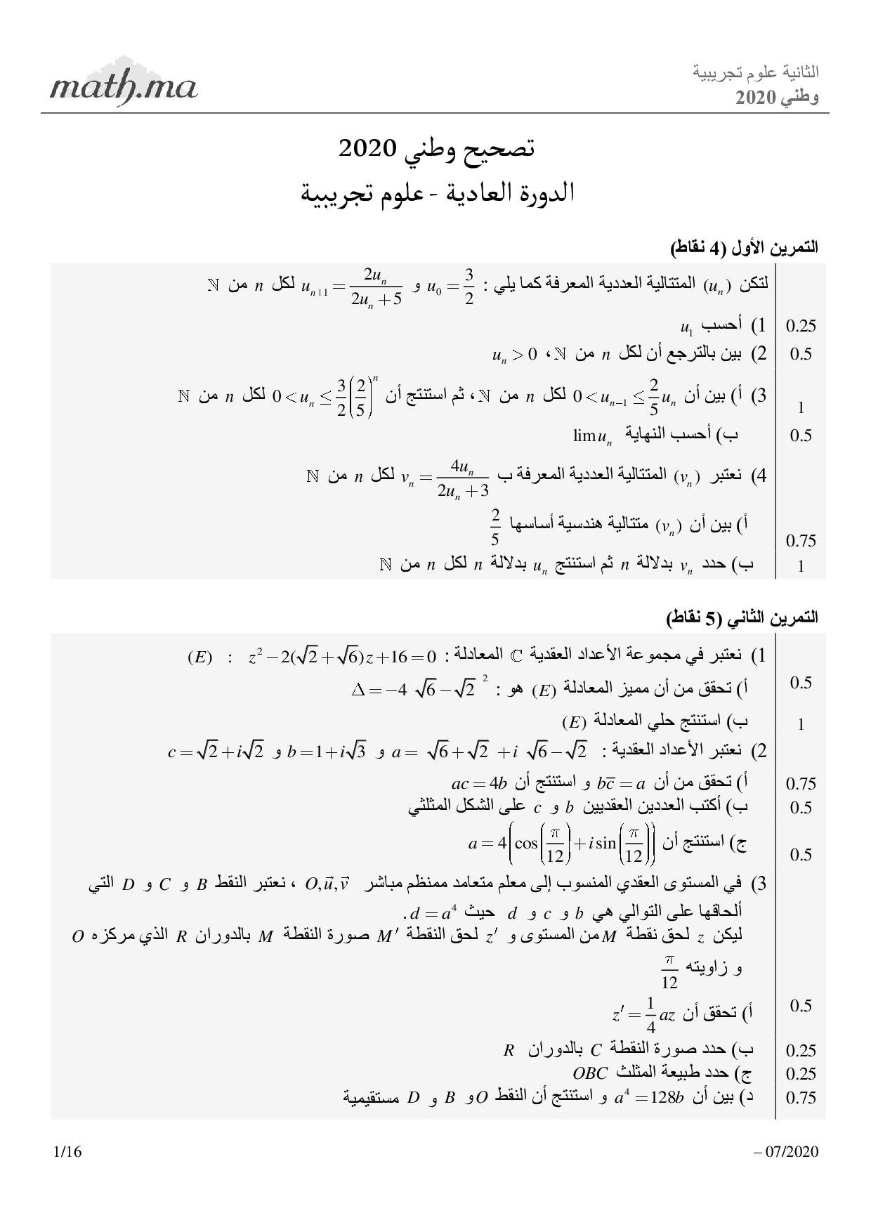 الرياضيات للشعب العلمية والتكنولوجية 2020 الدورة العادية - التصحيح