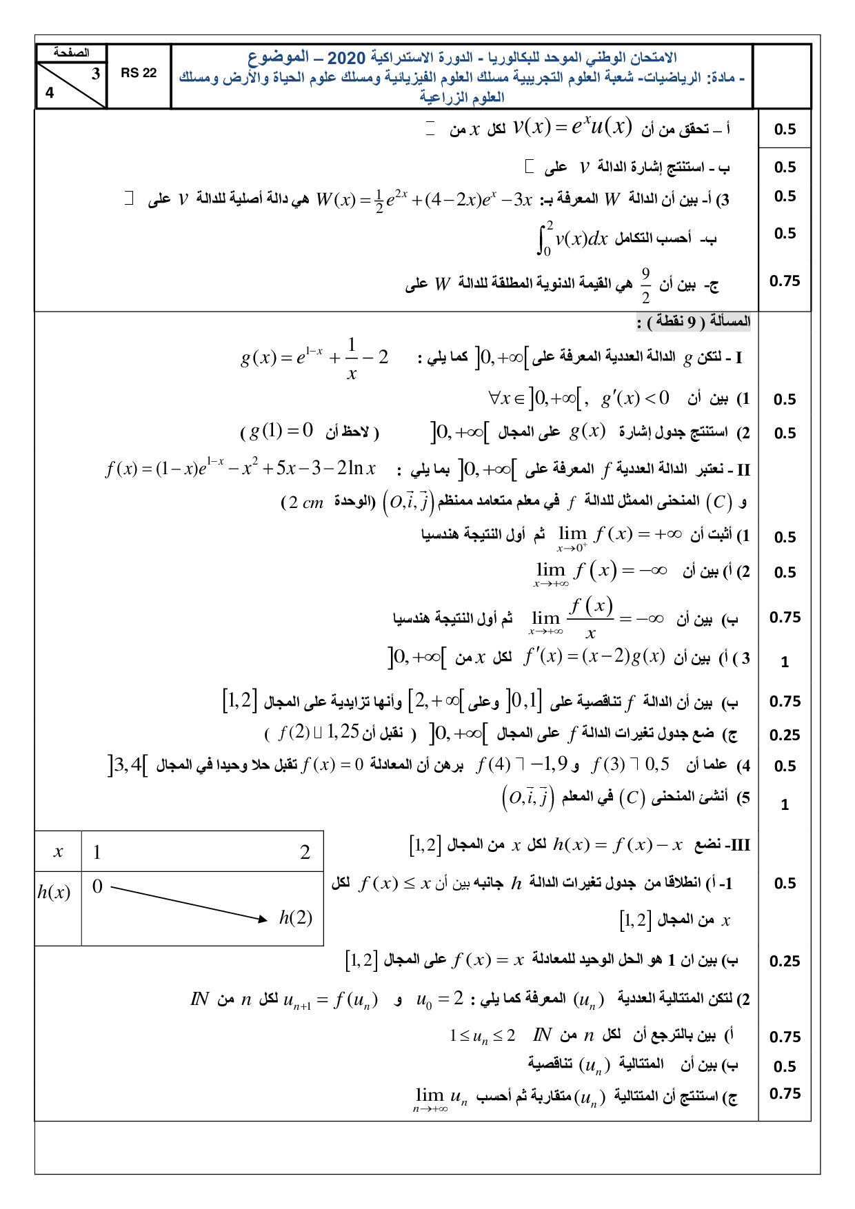 الرياضيات للشعب العلمية والتكنولوجية 2020 الدورة الإستدراكية - الموضوع