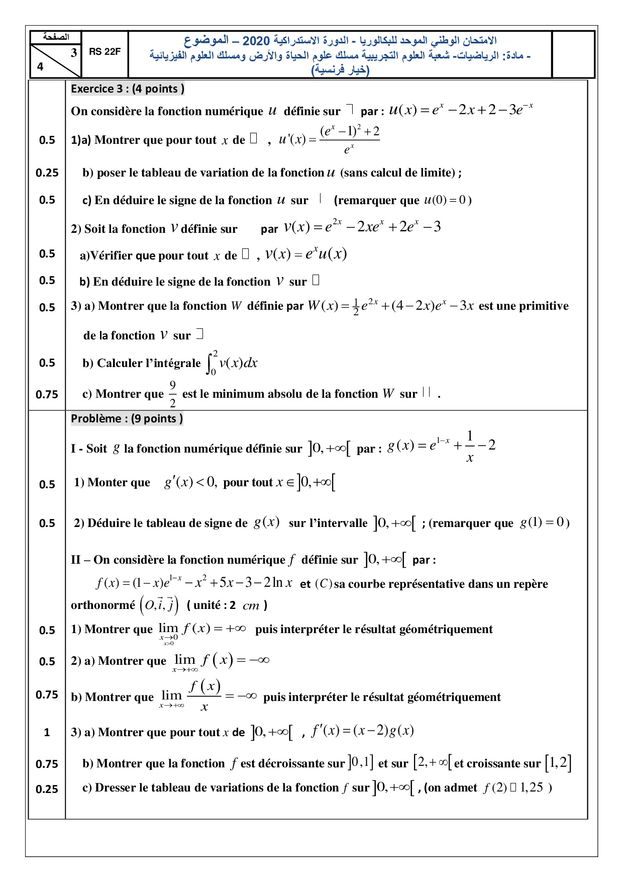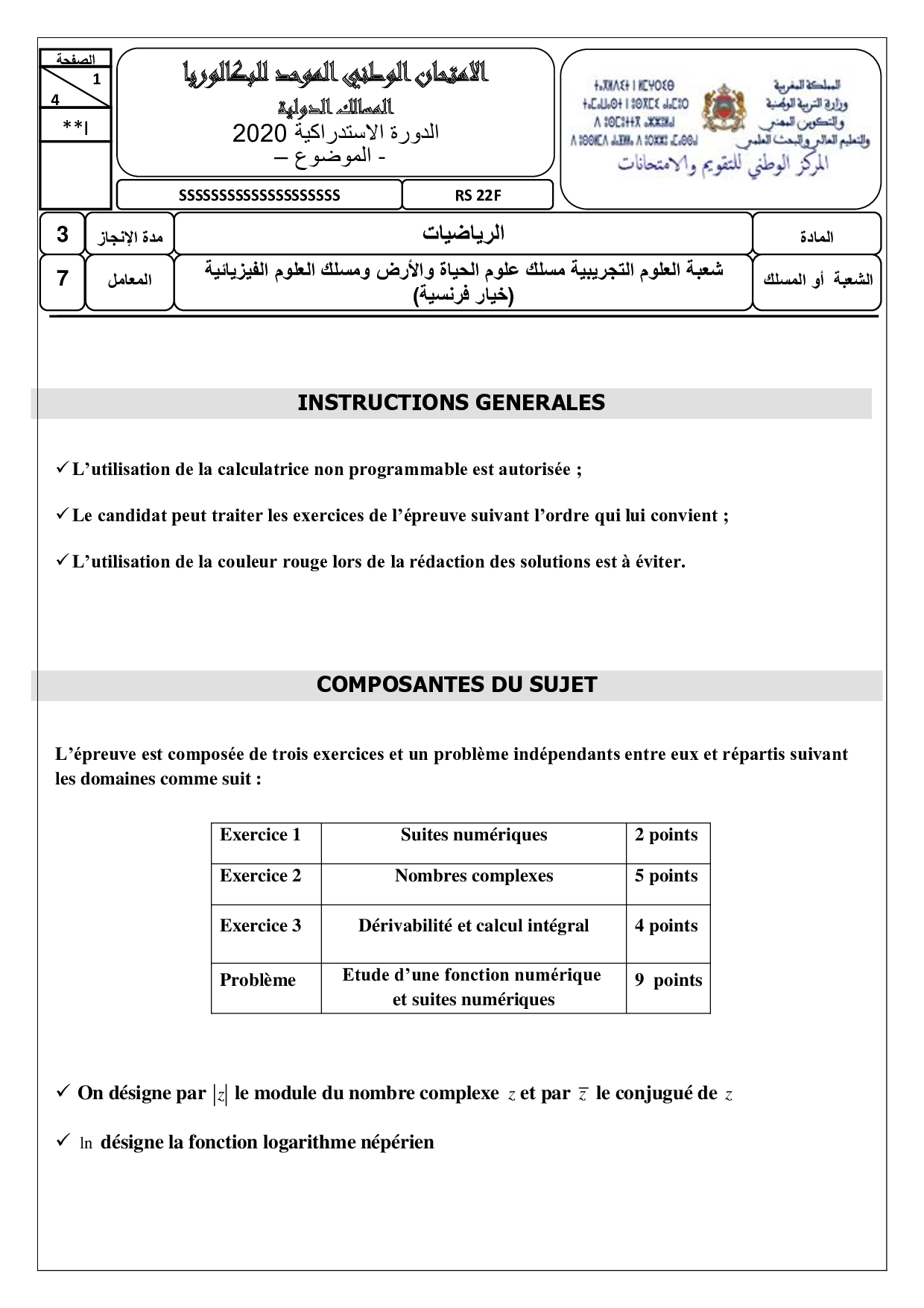 Examen National Maths Sciences et Technologies 2020 Rattrapage - Sujet