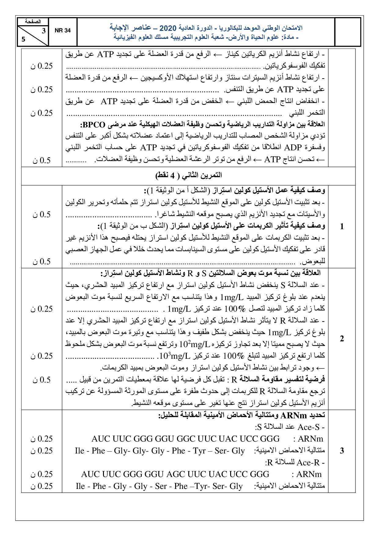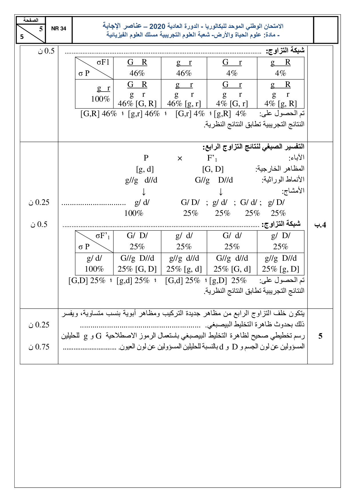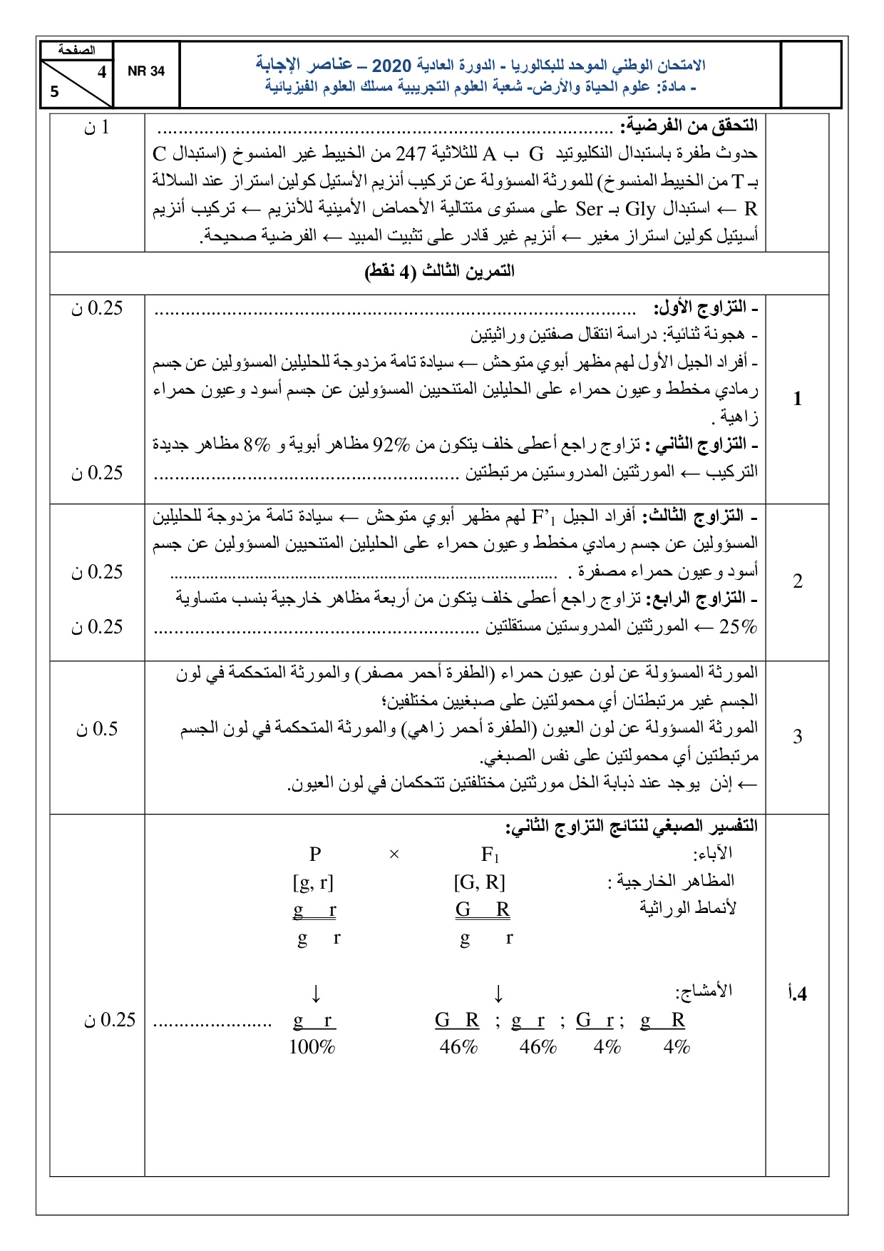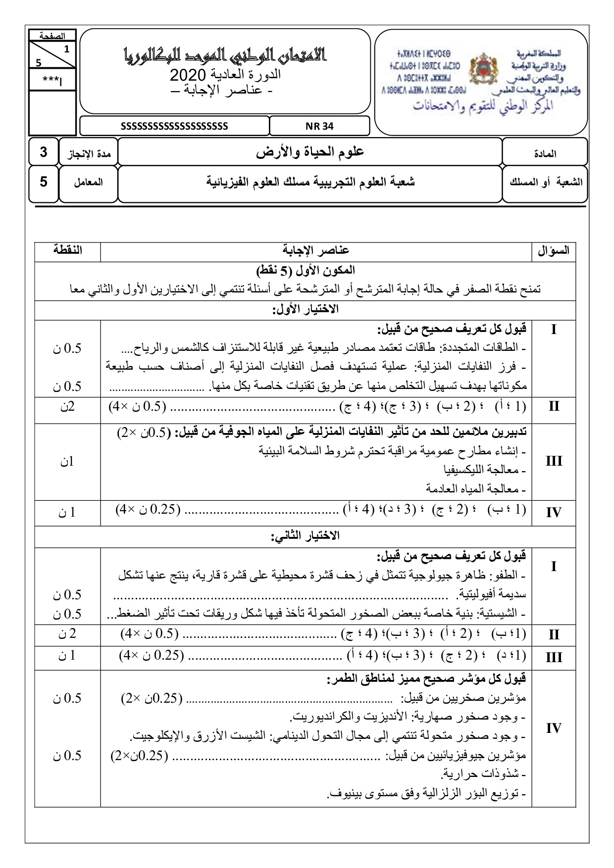 علوم الحياة والارض علوم فيزيائية 2020 الدورة العادية - التصحيح