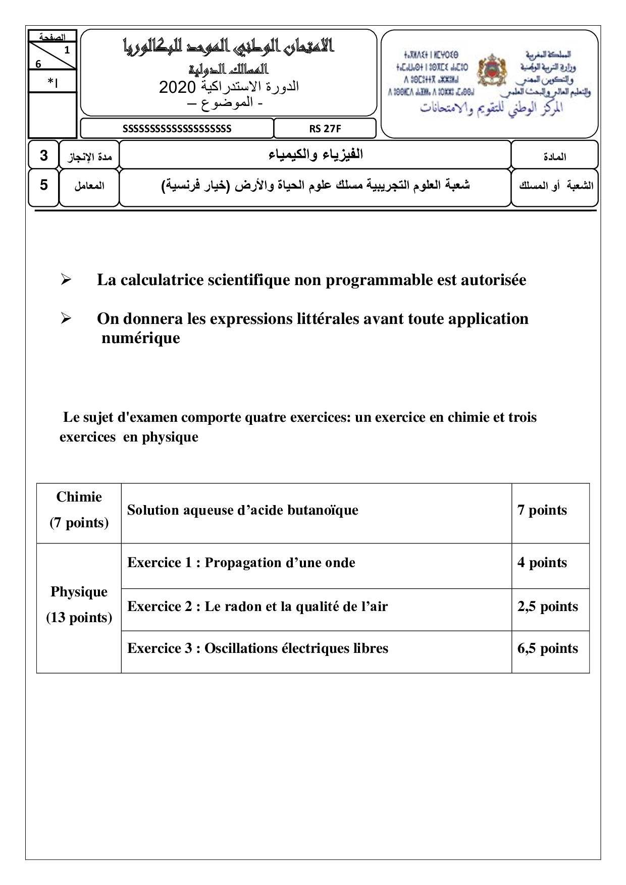 Examen National Physique-Chimie 2 Bac SVT 2020 Rattrapage - Sujet