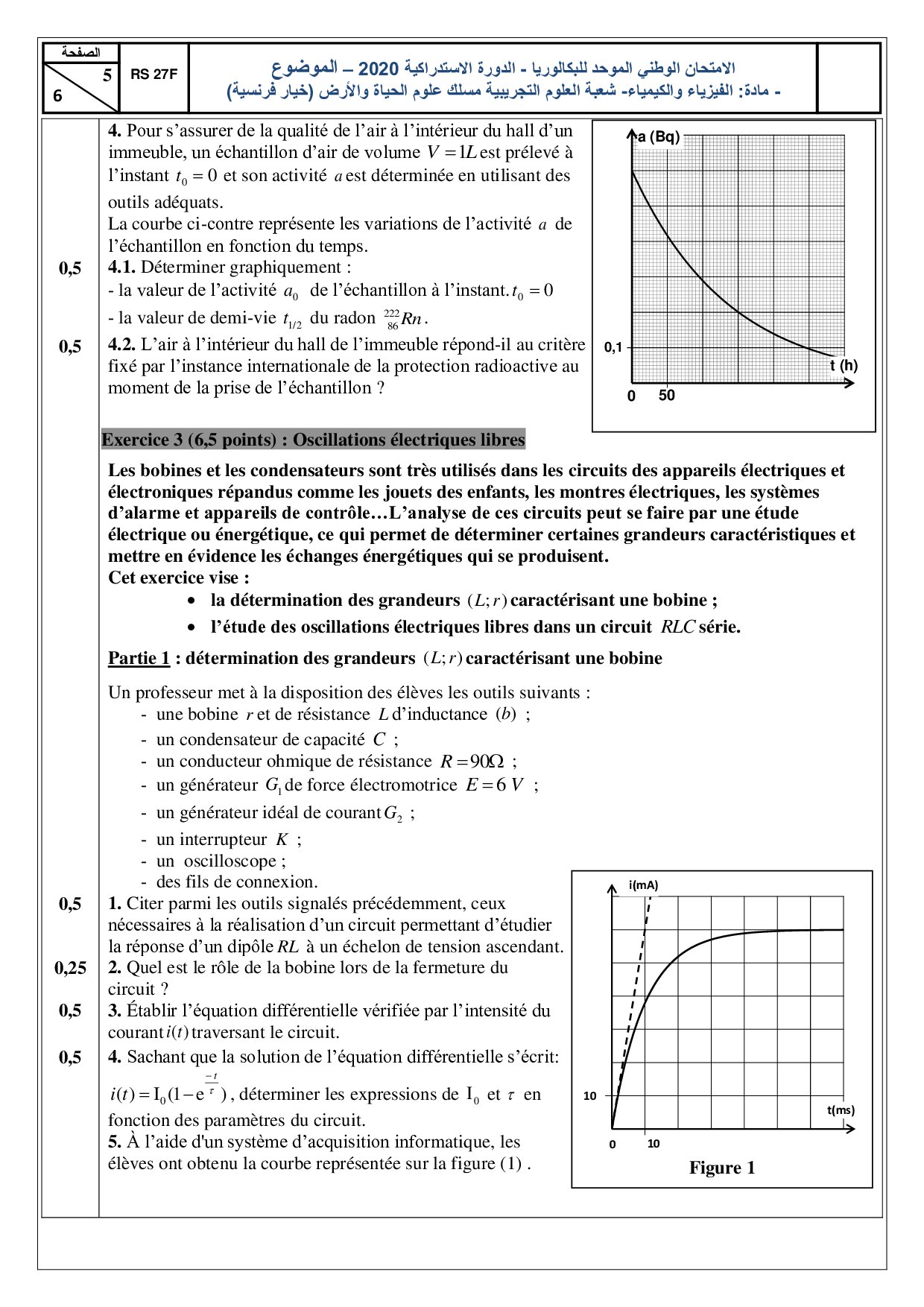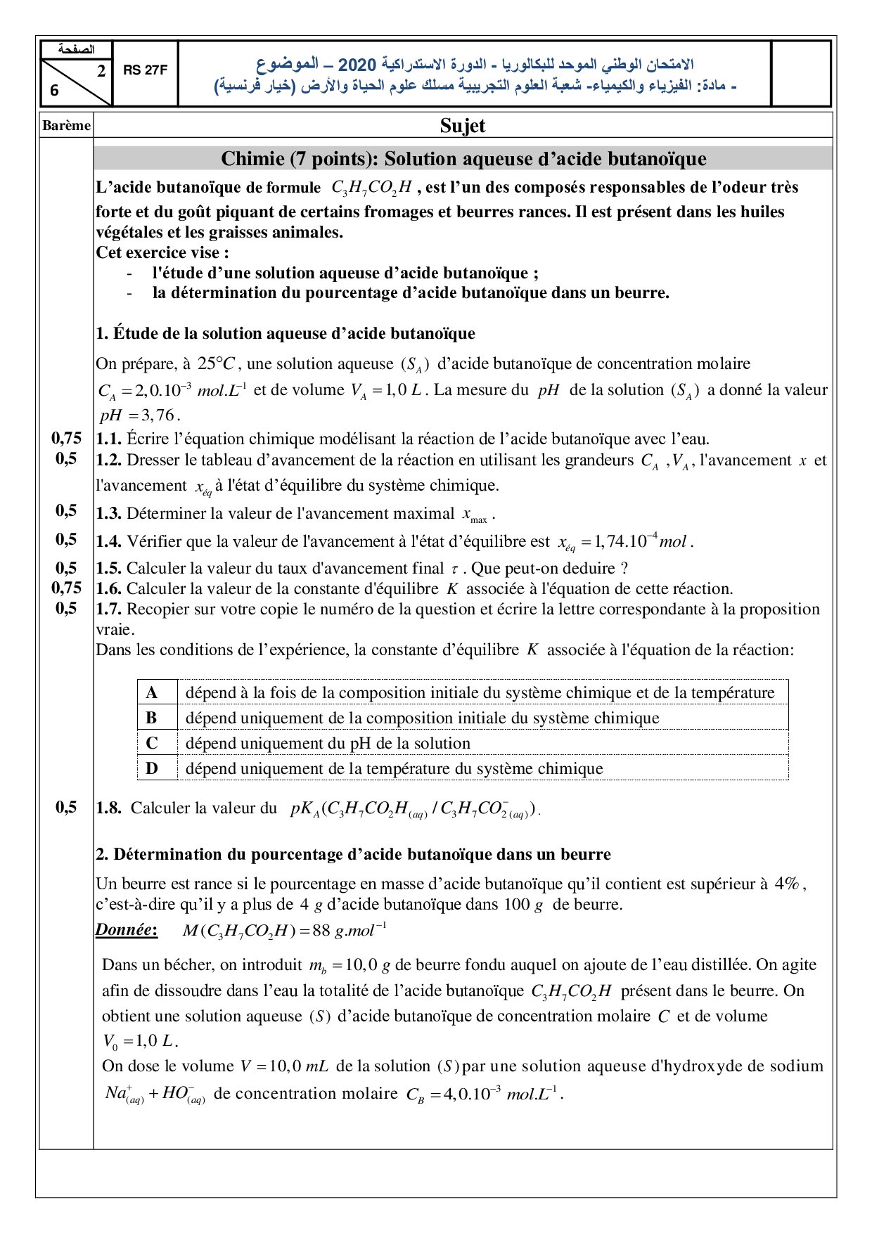 Examen National Physique-Chimie 2 Bac SVT 2020 Rattrapage - Sujet