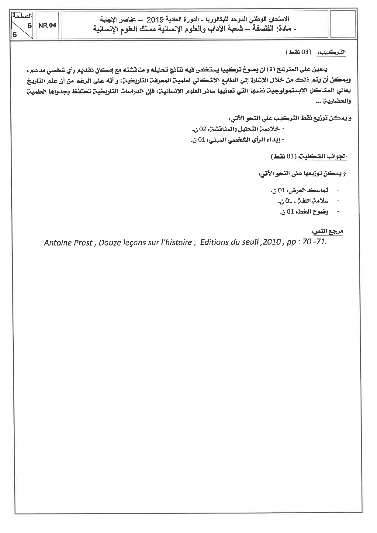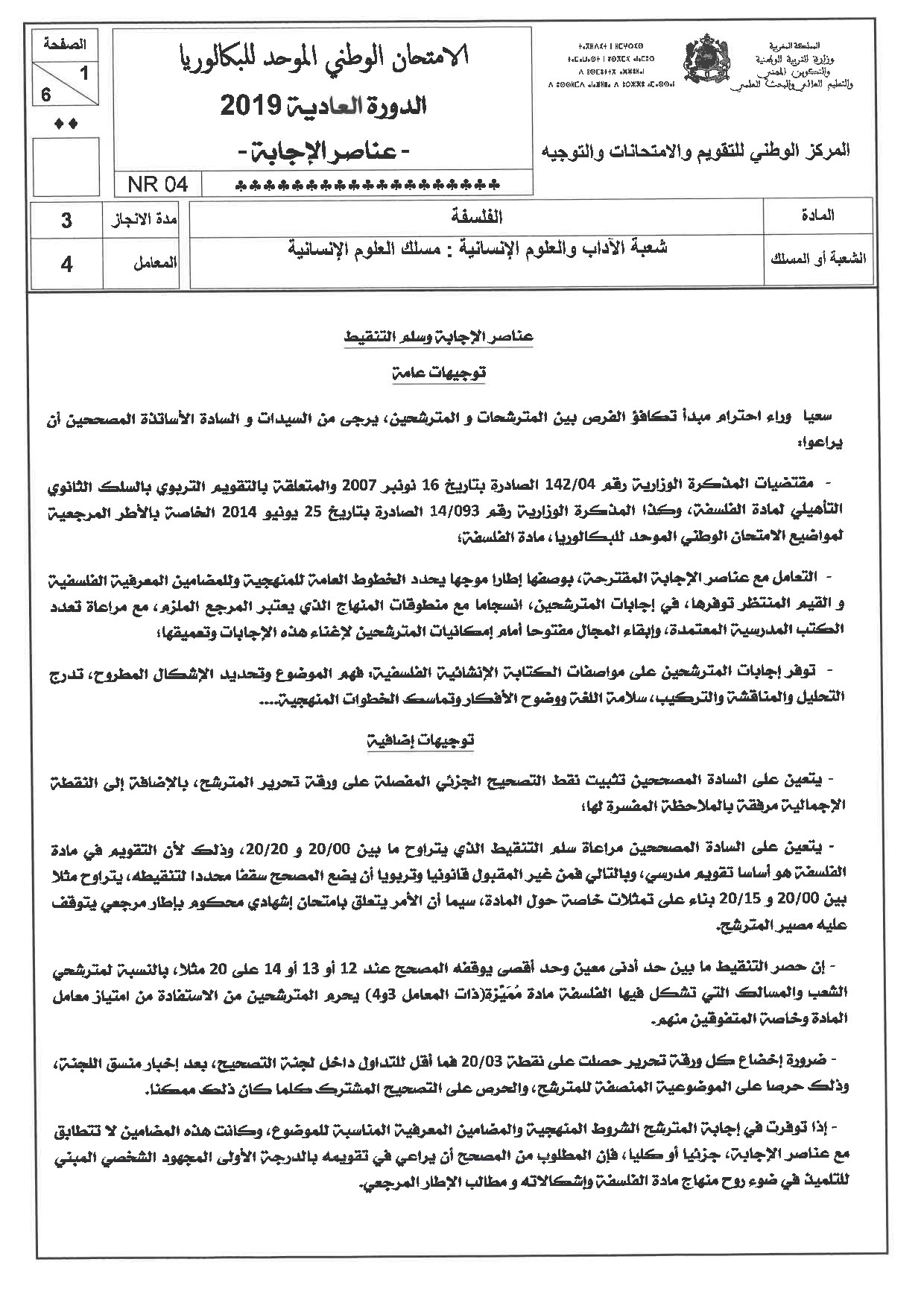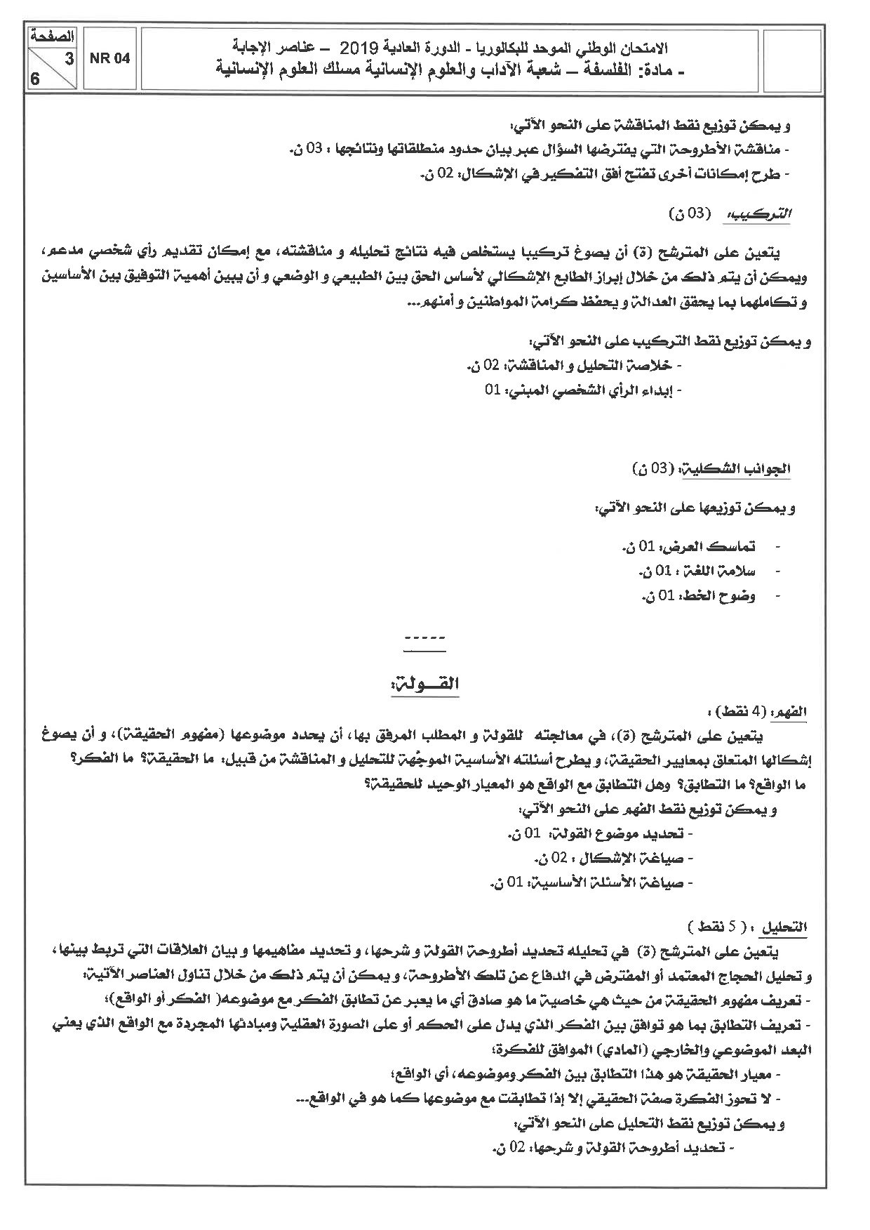 الفلسفة (شعبة العلوم الإنسانية) 2019 الدورة العادية - التصحيح