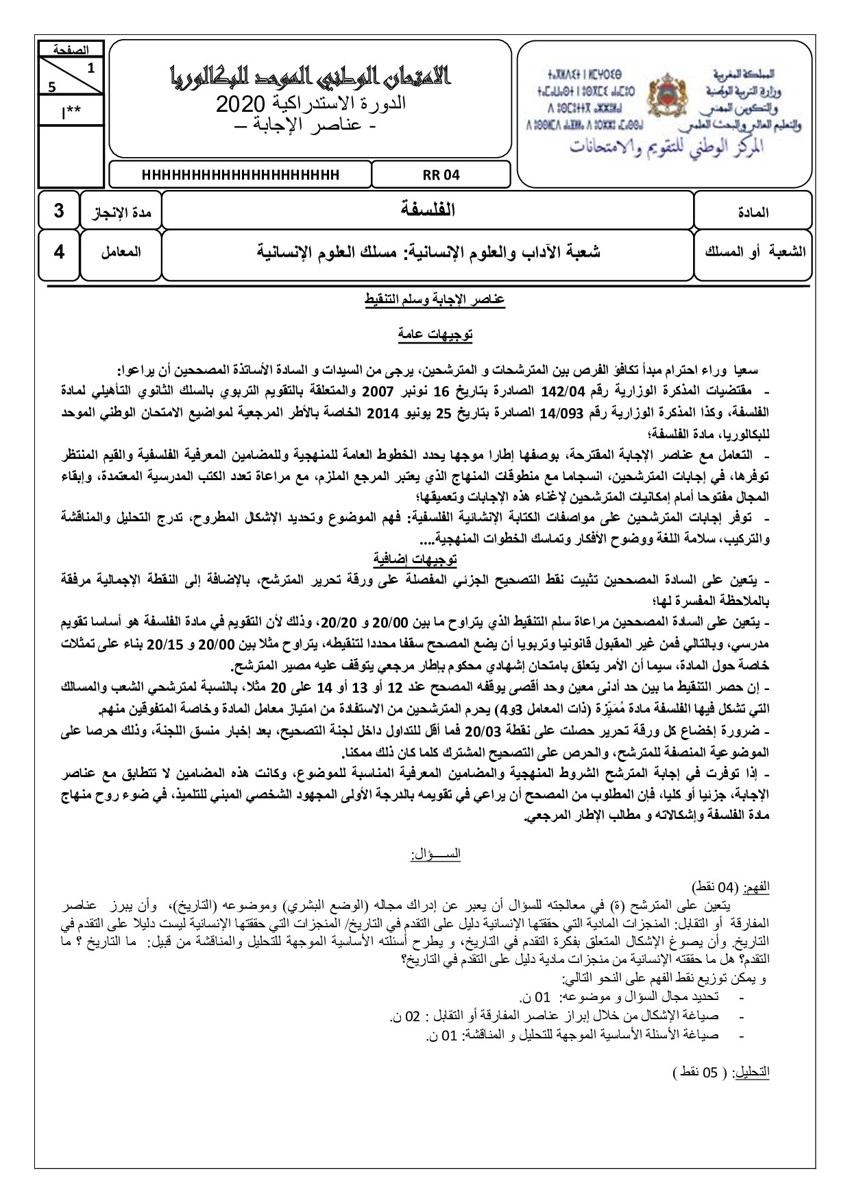 الفلسفة (شعبة العلوم الإنسانية) 2020 الدورة الإستدراكية - التصحيح