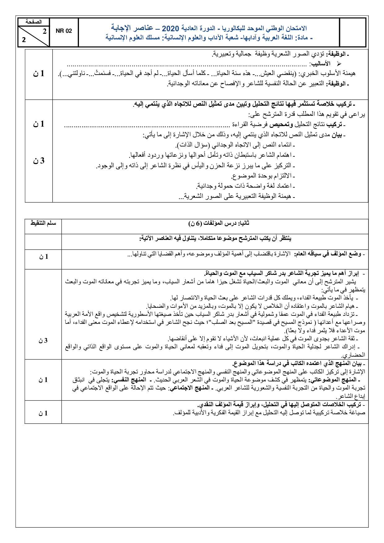 اللغة العربية (شعبة العلوم الإنسانية) 2020 الدورة العادية - التصحيح