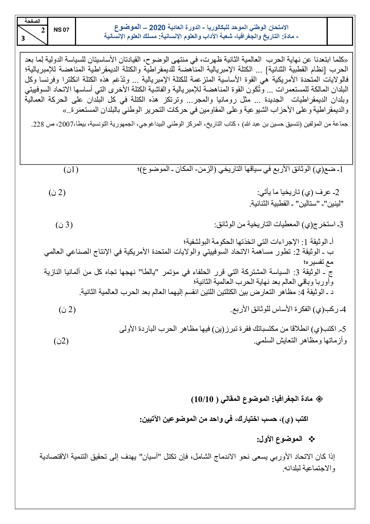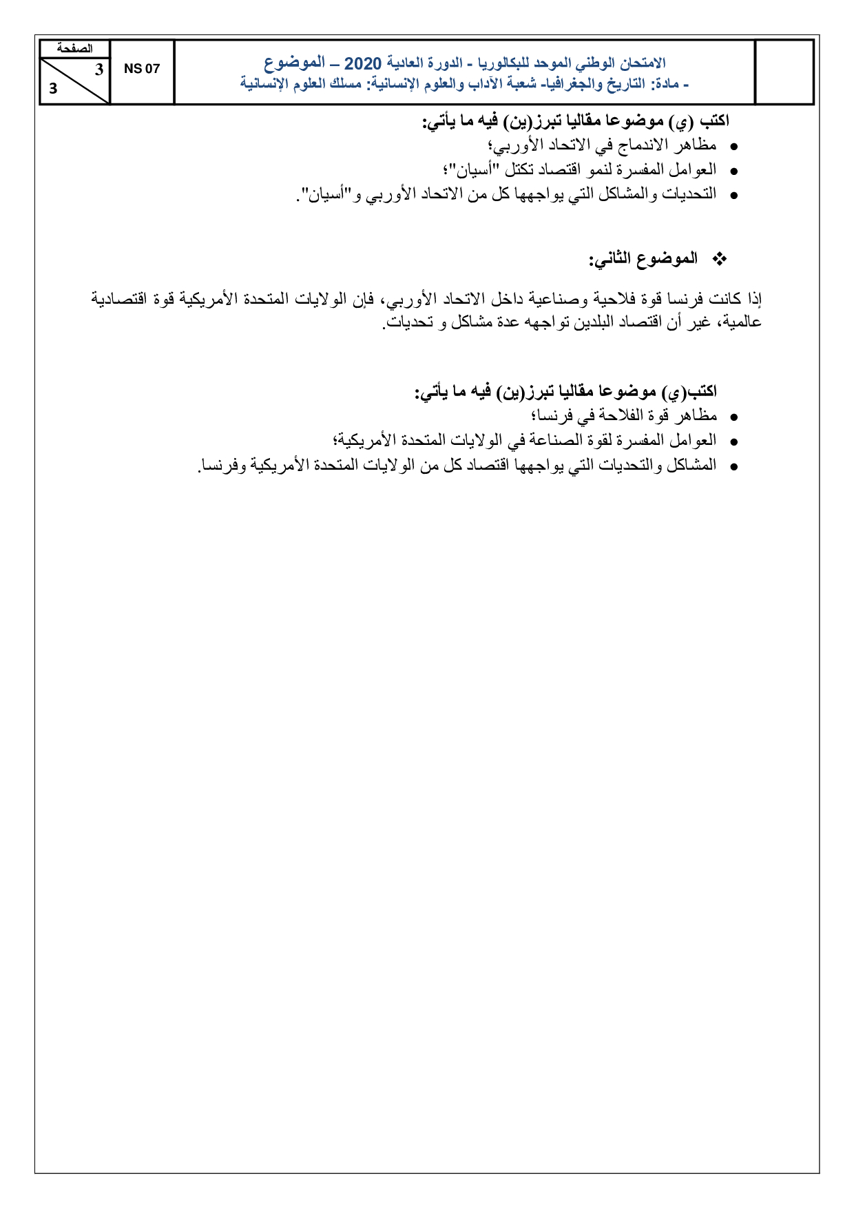 الإجتماعيات (شعبة العلوم الإنسانية) 2020 الدورة العادية - الموضوع